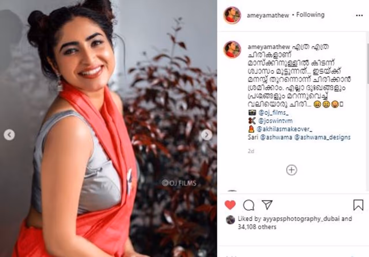 മാസ്കുകള് ധരിച്ചുകൊണ്ടുള്ള ചിത്രങ്ങള്കൊണ്ട് സോഷ്യല്മീഡിയ നിറയുമ്പോള്, എത്രയെത്ര ചിരികളാണ് മാസ്കിനുള്ളില് ശ്വാസംമുട്ടിയിരിക്കുന്നതെന്ന് അമേയ ചോദിക്കുന്നു. പതിവുപോലെ ആശംസകളും സംശയങ്ങളുമൊക്കെയായി ആരാധകര് ഈ പോസ്റ്റിനു താഴെയും എത്തുന്നുണ്ട്. അമേയ പങ്കുവച്ചിരിക്കുന്ന ചിത്രത്തിലെ വസ്ത്രത്തിന്റെ പേരെന്താണെന്നാണ് പലര്ക്കും അറിയേണ്ടത്. സാരിയോ ഫ്രോക്കോ എന്ന് സംശയിപ്പിക്കുന്ന തരത്തിലുള്ള ഒരു വസ്ത്രമാണ് ചിത്രത്തില് അമേയ ധരിച്ചിരിക്കുന്നത്.