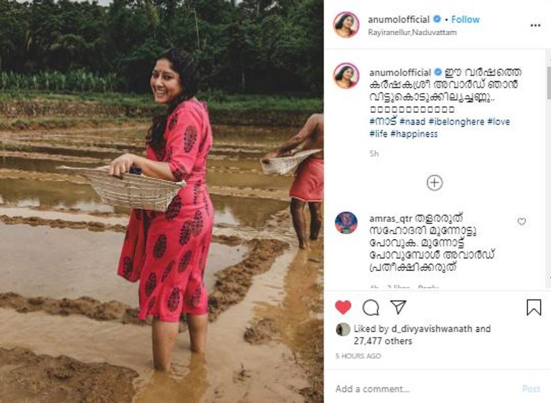 ഇപ്പോഴിതാ രസകരമായ ചിത്രം പങ്കുവച്ചിരിക്കുകയാണ് അനുമോൾ. തന്റെ പാടത്ത് വിത്തിടുന്നതിന്റെ ചിത്രമാണ് താരം പോസ്റ്റ് ചെയ്തിരിക്കുന്നത്. ' ഈ വർഷത്തെ കർഷകശ്രീ അവാർഡ് ഞാൻ വിട്ടുകൊടുക്കില്യച്ചണ്ണു..' - എന്ന കുറിപ്പോടെയാണ് ചിത്രം ഷെയർ ചെയ്തിരിക്കുന്നത്.