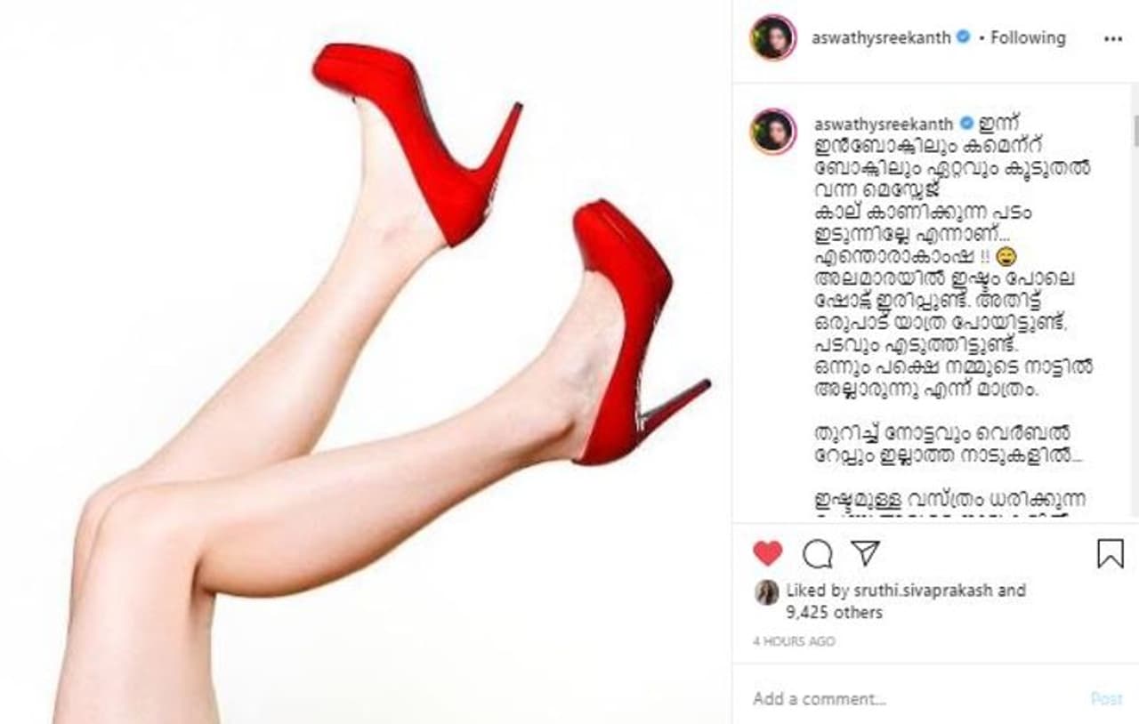 എന്താണ് കാലിന്റെ ചിത്രമിടാത്തത് എന്ന് ചോദിച്ച് രാവിലെമുതല് മെസേജായിരുന്നെന്നും, അതാണ് ഈ കുറിപ്പിന് കാരണമെന്നുമാണ് അശ്വതി പറയുന്നത്.