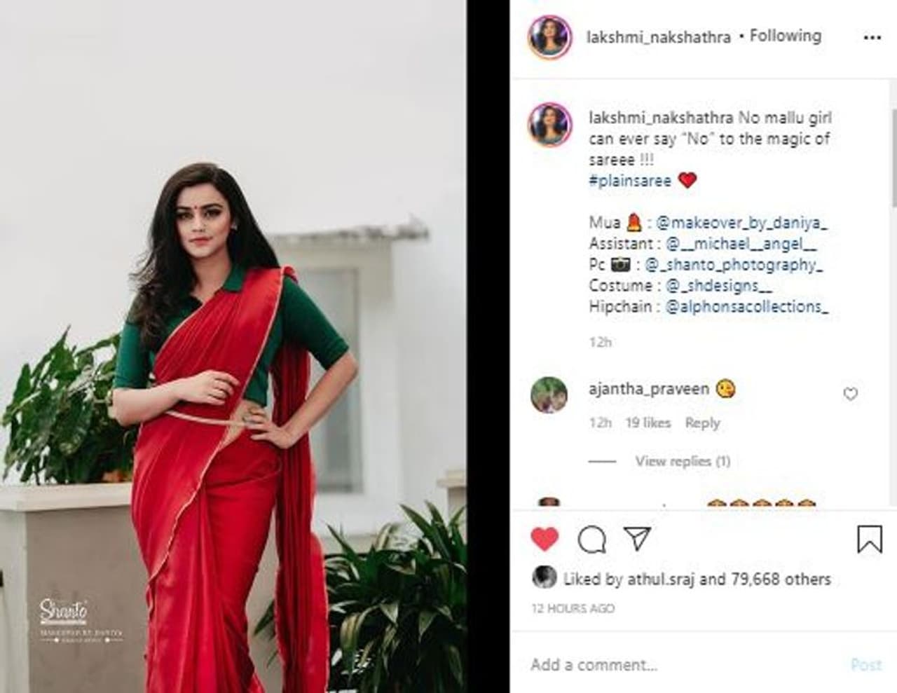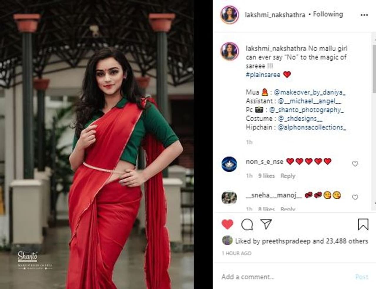'ഒരു മലയാളിപ്പെണ്കൊടിക്കും സാരിയുടെ മായാജാലത്തോട് നോ പറയാന് കഴിയില്ല' എന്ന ക്യാപ്ഷനോടെയാണ് റെഡ് കളര് സാരിയും പച്ച ബ്ലൗസുമായുള്ള തന്റെ ഏറ്റവുംപുതിയ ഫോട്ടോഷൂട്ട് ചിത്രങ്ങള് താരം പങ്കുവച്ചത്. എസ് എച്ച് ഡിസൈനര് സ്റ്റോറാണ് കോസ്റ്റിയൂം ഭംഗിയാക്കിയിരിക്കുന്നത്. നിരവധി ആളുകളാണ് അവതാരകയായ ലക്ഷ്മിക്ക് ആശംസകളുമായെത്തുന്നത്. സാരിയില് താരം കൂടുതല് ഭംഗിയായിരിക്കുന്നുവെന്നാണ് എല്ലാവരുംതന്നെ അഭിപ്രായപ്പെടുന്നത്.