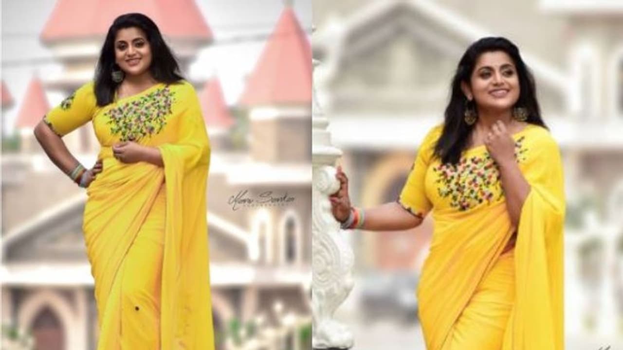നെക്ക് വര്ക്കുള്ള മഞ്ഞ സാരിയിലാണ് ഫോട്ടോഷൂട്ടില് വീണ പ്രത്യക്ഷപ്പെട്ടിരിക്കുന്നത്