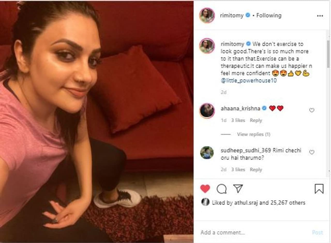 വ്യായാമം എത്രത്തോളം പ്രധാനമാണെന്ന് വീണ്ടും ഓർമിപ്പിക്കുകയാണ് റിമി ഇൻസ്റ്റഗ്രാം കുറിപ്പിലൂടെ. 'കാഴ്ച സൗന്ദര്യത്തിന് മാത്രമായി നമ്മൾ വ്യായാമത്തെ കാണരുത്. കാരണം സൗന്ദര്യം എന്നതിലൊക്കെ ഉപരി പലതും നൽകാൻ വ്യായാമത്തിന് സാധിക്കും. ഇത് ഒരു ഒരു ചികിത്സാ രീതിയാകാം. ഇത് നമ്മെ സന്തോഷിപ്പിക്കും, അതിലുപരി കൂടുതൽ ആത്മവിശ്വാസം നൽകുകയും ചെയ്യും'- ചിത്രത്തിനൊപ്പം റിമി കുറിക്കുന്നു.