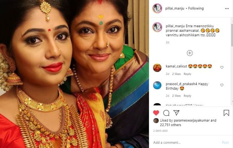 ഭാഗ്യലക്ഷ്മിയുടെ പിറന്നാളിന് ആശംസകളുമായി എത്തിയിരിക്കുകയാണ് മഞ്ജുവിപ്പോൾ. 'എന്റെ മീനൂട്ടിക്ക് പിറന്നാൾ ആശംസകൾ, വന്നിട്ട് ആഘോഷിക്കാം ട്ടോ'- എന്നാണ് തങ്ങൾ ഒന്നിച്ചുള്ള ചിത്രത്തിനൊപ്പം ജന്മദിനസന്ദേശത്തിൽ മഞ്ജു കുറിച്ചിരിക്കുന്നത്. 'മമ്മീടെ കുഞ്ഞുവാവ ഹാപ്പി ബെർത്ത് ഡേ പെണ്ണേ' എന്നാണ് മറ്റൊരു ചിത്രത്തോടൊപ്പം മഞ്ജു കുറിച്ചിരിക്കുന്നത്.