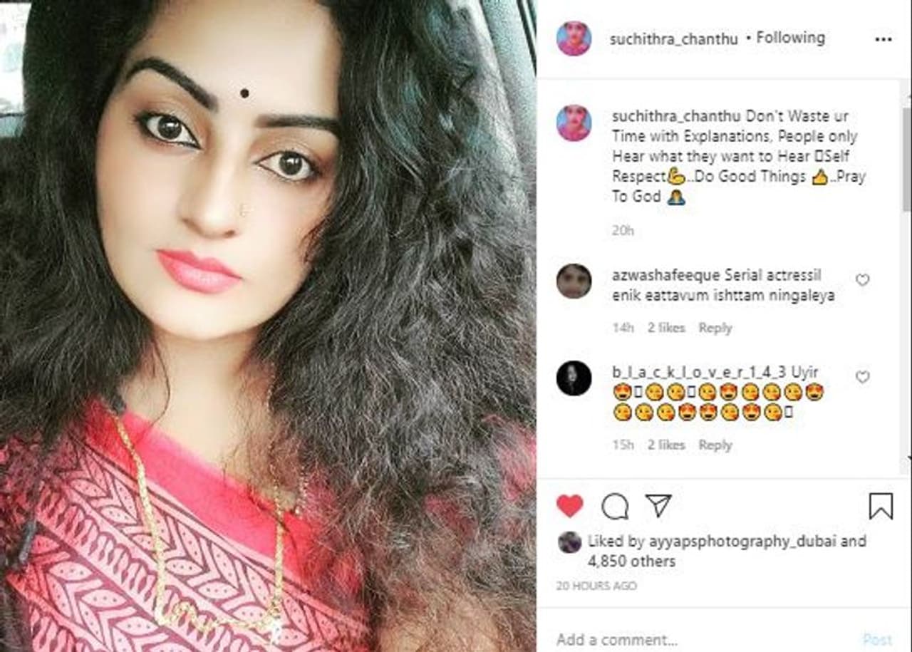 ആത്മാഭിമാനമാണ് വലുതെന്ന് പറയുന്നതായിരുന്നു പത്മിനിയുടെ കുറിപ്പ്. 'വെറുതെ വിശദീകരണംനല്കി നിങ്ങളുടെ സമയം പാഴാക്കരുത്. ആളുകള് അവര്ക്കിഷ്ടമുള്ളത് മാത്രമാണ് കേള്ക്കാനാഗ്രഹിക്കുന്നത്. ആത്മാഭിമാനമാണ് വലുത്. നല്ലതുചെയ്യുക, ദൈവത്തോട് പ്രാര്ത്ഥിക്കുക.' എന്നാണ് സുചിത്ര ചിത്രത്തോടൊപ്പം കുറിച്ചിരിക്കുന്നത്. നിരവധി ആളുകളാണ് സുചിത്രയോട് കുശലം ചോദിച്ചെത്തുന്നത്. പത്മിനിയെ സോഷ്യല്മീഡിയയിലെങ്കിലും ഇപ്പോഴും കാണാനാകുന്നതിന്റെ ആശ്വാസവും ചിലരെങ്കിലും പങ്കുവയ്ക്കുന്നുണ്ട്.