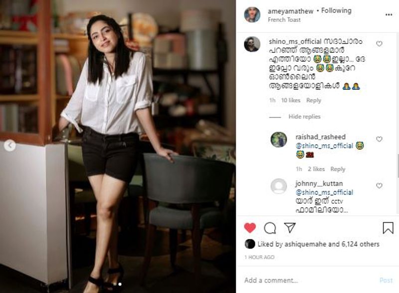 'കാലുകള് കണ്ടാല് സദാചാരം ഒഴുകുന്ന ചേട്ടന്മാര്ക്കുവേണ്ടി, അവതരിപ്പിക്കുന്ന പുതിയ നാടകം, 'ഈ കാലുകള് നിങ്ങളെ ചവിട്ടി കൂട്ടാന് ഉള്ളതാണ്' ' എന്നാണ് തന്റെ ചിത്രം പങ്കുവച്ചുകൊണ്ട് അമേയ കുറിച്ചത്.