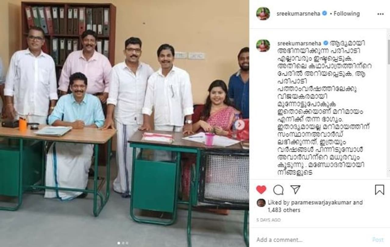മറിമായത്തിന് മികച്ച കോമഡി പ്രോഗ്രാമിനായുള്ള സംസ്ഥാന അവാര്ഡ് കിട്ടിയ സന്തോഷം പങ്കുവെക്കുകയാണ് സ്നേഹ