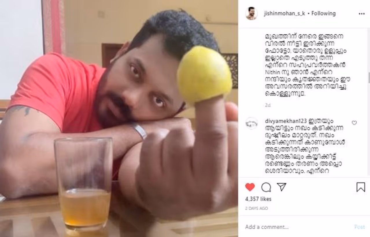 'മുദ്ര ശ്രദ്ധിക്കണം... മുദ്ര. ഇത് ഏകമുദ്ര. അറ്റത്തൊരു നാരങ്ങ ഉള്ളത് കൊണ്ട് അര്ത്ഥം മാറി. അപ്പൊ പിന്നെ തെറ്റിദ്ധരിക്കണ്ട. നഖം കടിക്കുന്നവര്ക്ക് ഒരു ബോധവത്കരണത്തിന് വേണ്ടിയാണ് ഈ ഫോട്ടോ ഇട്ടത്. സച്ചിന് ടെന്ഡുല്ക്കര്ക്കും എനിക്കും ഒക്കെ ആകെയുള്ള ദുശീലമാണ് ഈ നഖം കടിക്കല്. ഇതിനെക്കുറിച്ചു ഞങ്ങള് പലപ്പോഴും സംസാരിച്ചിട്ടുള്ളതാ. അവനു പിന്നെ ക്രിക്കറ്റിന്റെ പിരിമുറുക്കം ആണെന്ന് വിചാരിക്കാം. എനിക്കാണെങ്കില്.. ഈ മണി ഹെയ്സ്റ്റ് പോലുള്ള സീരീസ് ഒക്കെ കാണുമ്പോള് എങ്ങനാ നഖം കടിക്കാതിരിക്കുന്നത്. അല്ലേ? അങ്ങനെ കടിച്ചു കടിച്ചു നഖത്തിന്റെ അടിവേര് വരെ പിഴുതെടുക്കും. അപ്പോഴുണ്ടാകുന്ന ഒരു മനസ്സുഖമുണ്ടല്ലോ.. എന്റെ പൊന്നു സാറേ.. പറഞ്ഞറിയിക്കാന് പറ്റില്ല. പിന്നെയാണ് ഇതിന്റെ പരിണിത ഫലം. ഇതങ്ങു പഴുക്കും. നല്ല വിങ്ങുന്ന വേദനയായിരിക്കും. ആ സമയത്ത് ഈ വിരല് തന്നെ ആയിരിക്കും എപ്പോഴും എവിടെയെങ്കിലും തട്ടുന്നതും. സ്വര്ഗ്ഗം കാണും. അപ്പൊ ആരൊക്കെയോ പറഞ്ഞു തരുന്ന ഒറ്റമൂലി ആണ് ഈ നാരങ്ങ പ്രയോഗം. ഒരു നാരങ്ങ മുറിച്ച് കട്ടന് ചായയില് പിഴിഞ്ഞൊഴിച്ച്, സുലൈമാനിയും കുടിച്ച്, ആ നാരങ്ങത്തോട് വിരലില് ഇറക്കി വച്ച് ഇങ്ങനെ ഇരിക്കാം. ഇതൊക്കെ കഴിഞ്ഞു പഴുപ്പൊക്കെ മാറിക്കഴിഞ്ഞാല്, തൊലിയൊക്കെ പോയി, വിരലിന്റെ അറ്റമൊക്കെ ഉണങ്ങി, ഒരുമാതിരി ഒണക്കമത്തി പോലെ ഉണ്ടാകും. അതുകൊണ്ട് എന്റെ പൊന്നു നഖംകടി കൂട്ടുകാരെ.. എനിക്കൊന്നേ പറയാനുള്ളൂ. ഇനി മേലാല് നിങ്ങള് നഖം കടിക്കുമ്പോള്, ഈ നടുവിരല് ഒഴിച്ചുള്ള നഖമേ കടിക്കാന് പാടുള്ളു. അല്ലെങ്കില് ഇതുപോലെ നടുവിരല് പൊക്കിപ്പിടിച്ചോണ്ട് ഇരിക്കേണ്ടി വരും. സൂക്ഷിച്ചാല് ദുഖിക്കേണ്ട.