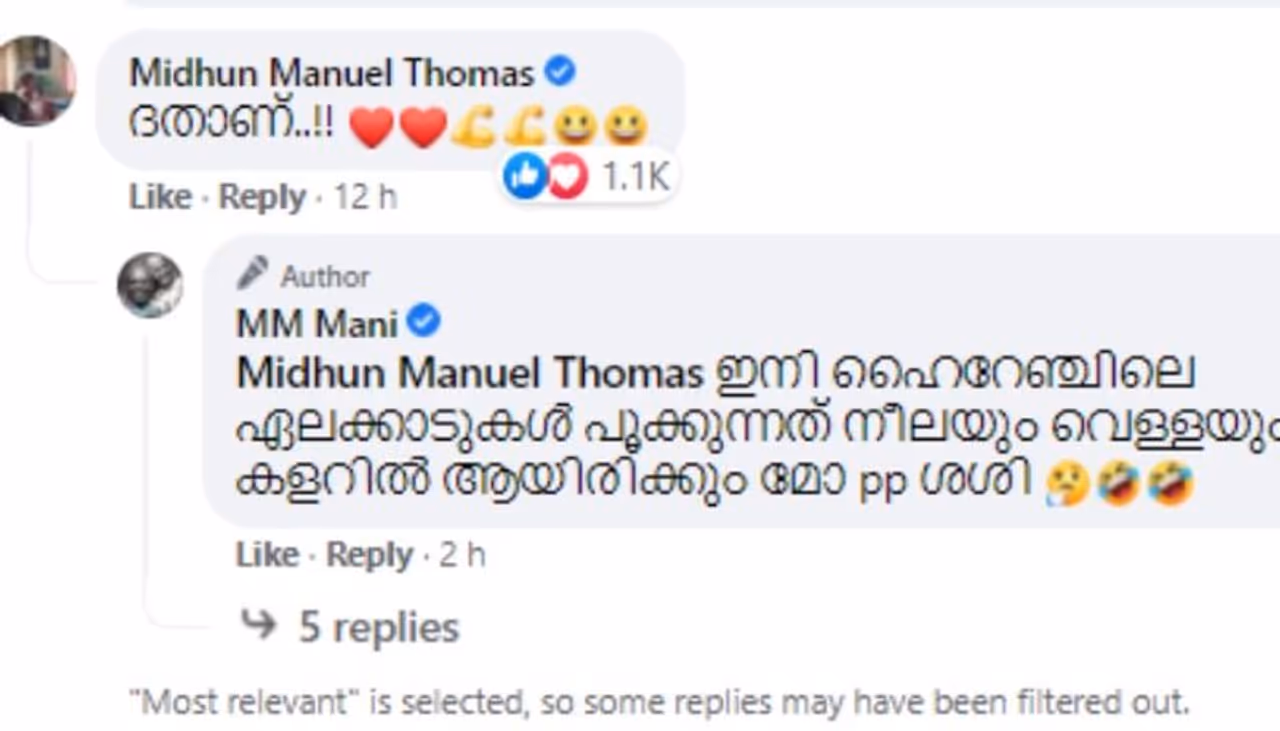 ‘ഇനി ഹൈറേഞ്ചിലെ ഏലക്കാടുകൾ പൂക്കുന്നത് നീലയും വെള്ളയും കളറിൽ ആയിരിക്കും പിപി ശശി’ എന്നാണ് എംഎം മണിയുടെ മറുപടി. മിഥുന് പുറമെ നിരവധിപ്പേർ എംഎം മണിയുടെ പോസ്റ്റിന് താഴെ കമന്റുകളുമായി എത്തിയിരുന്നു. മിക്കവർക്കും അദ്ദേഹം രസകരങ്ങളായ മറുപടികളും നൽകിയിട്ടുണ്ട്.