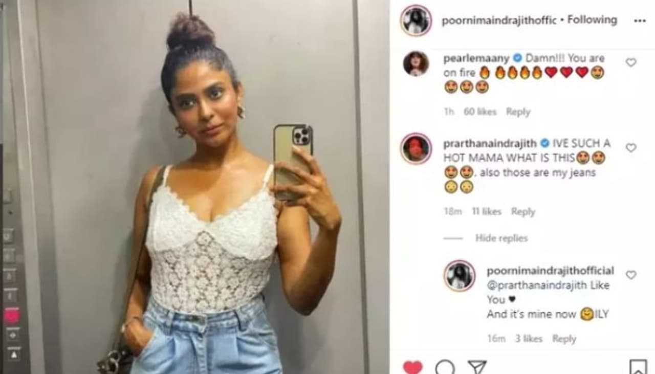 എന്നാൽ, പൂർണിമ ധരിച്ചിരിക്കുന്ന ജീൻസ് മകൾ പ്രാർത്ഥനയുടേതാണ്. ഇക്കാര്യം പ്രാർത്ഥന തന്നെയാണ് കമന്റ് ചെയ്തിരിക്കുന്നത്. 'എനിക്കിത്ര ഹോട്ടായ ഒരു അമ്മയുണ്ട്. അതെന്റെ ജീൻസ് ആണ്' എന്ന കമന്റാണ് പ്രാർത്ഥന പങ്കുവച്ചിരിക്കുന്നത്. ആ ജീൻസ് ഇനി മുതൽ തന്റെതാണെന്നായിരുന്നു മകളുടെ കമന്റിന് പൂർണിമ നൽകിയ മറുപടി.