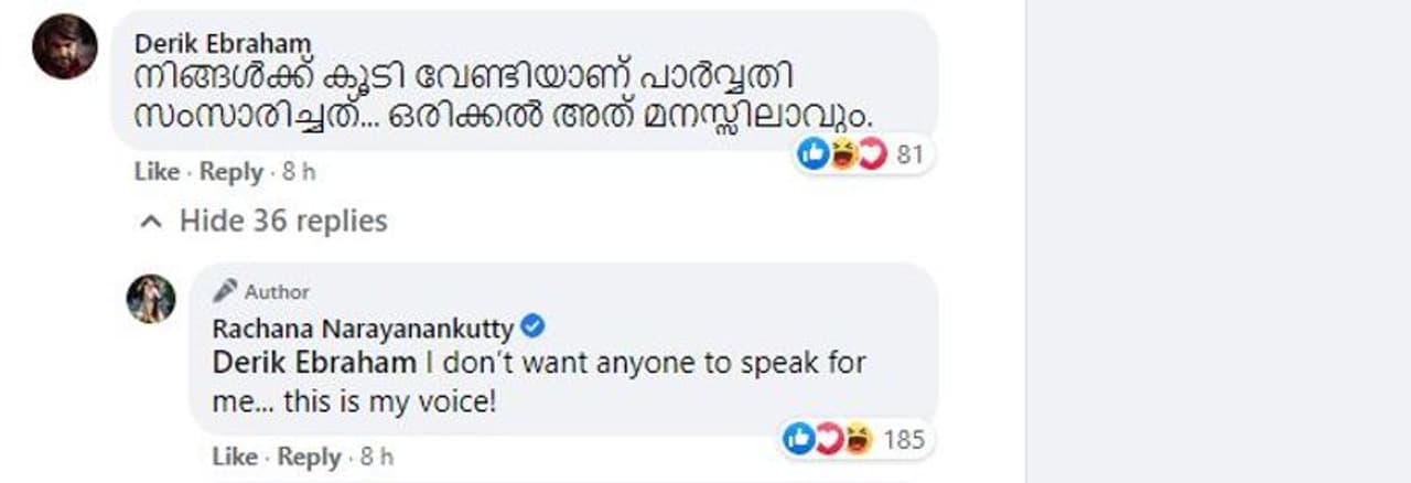 അത്തരത്തിലൊരു കമന്റ് നടി പാര്വ്വതിയുടെ 'അമ്മ'യിലെയും ഡബ്ല്യുസിസിയിലെയും ഇടപെടലിനെക്കുറിച്ച് സൂചിപ്പിക്കുന്നതായിരുന്നു. 'നിങ്ങള്ക്ക് കൂടി വേണ്ടിയാണ് പാര്വ്വതി സംസാരിച്ചത്. ഒരിക്കല് അത് മനസിലാവും' എന്നായിരുന്നു രചനയുടെ നിലപാടിനെ വിമര്ശനസ്വരത്തില് സമീപിക്കുന്ന കമന്റ്. അതിന് രചനയുടെ പ്രതികരണം ഇങ്ങനെ- "എനിക്കുവേണ്ടി ആരും സംസാരിക്കേണ്ടതില്ല. ഇതാണ് എന്റെ ശബ്ദം".