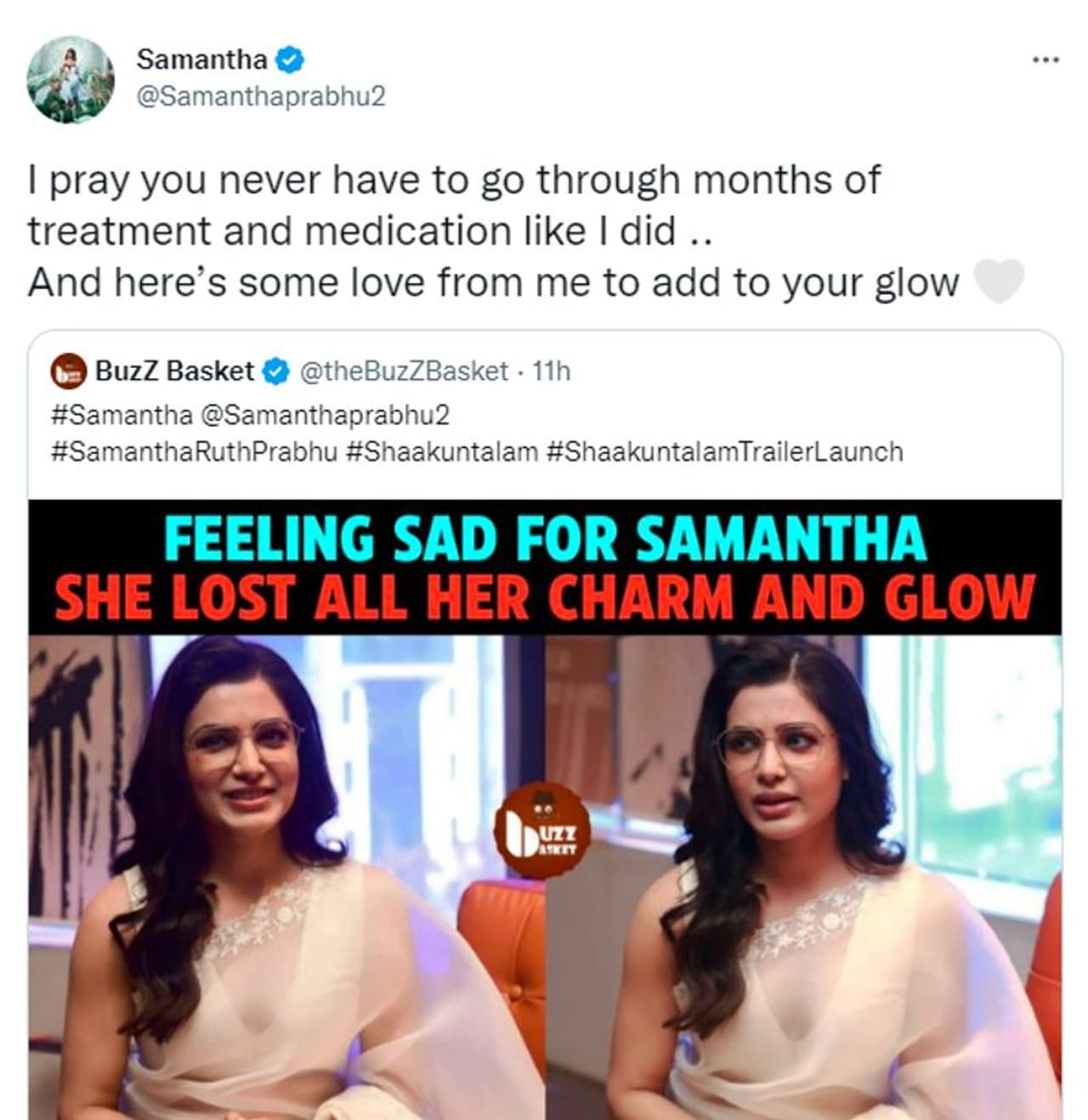 എന്നാല് നടി ഇതിനോട് അധികം വൈകാതെ തന്നെ ട്വിറ്ററിലൂടെ പ്രതികരിച്ചു. ഞാന് ഈ മാസങ്ങളില് കടന്നുപോയ ചികില്സയിലൂടെയോ, മരുന്നുകളിലൂടെയോ ഒരിക്കലും നിങ്ങള്ക്ക് കടന്നുപോകാന് ഇടവരാതിരിക്കട്ടെ എന്ന് ഞാന് പ്രാര്ത്ഥിക്കാം. നിങ്ങളുടെ നിളക്കത്തിനെ തൃപ്തിപ്പെടുത്താന് കുറച്ച് സ്നേഹം തരാം - സാമന്ത മറുപടി നല്കി.