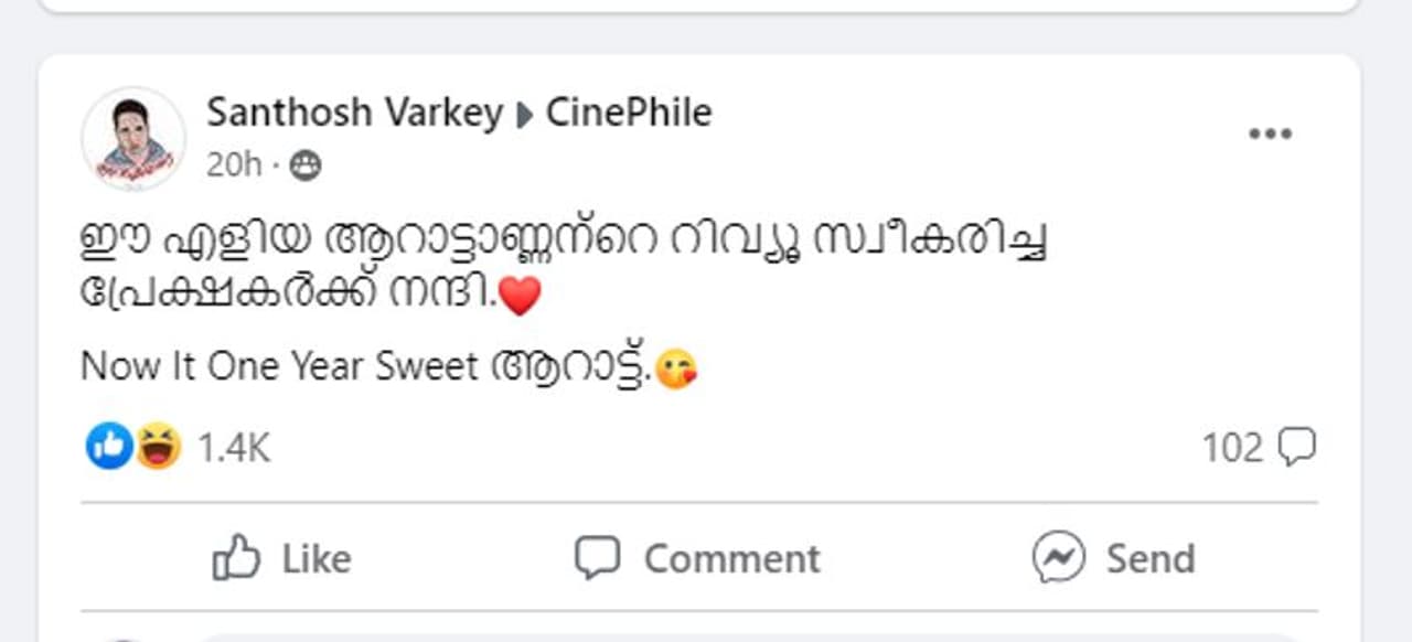 'ഈ എളിയ ആറാട്ടാണ്ണന്റെ റിവ്യൂ സ്വീകരിച്ച പ്രേക്ഷകർക്ക് നന്ദി. Now It One Year Sweet ആറാട്ട്', എന്നാണ് സന്തോഷ് വർഷി തന്റെ ഫേസ്ബുക്കിൽ കുറിച്ചിരിക്കുന്നത്. 'ഒരു സിനിമ കാരണം സോഷ്യൽ മീഡിയ മാറ്റി മറിച്ച വ്യക്തി', എന്നാണ് പോസ്റ്റിന് താഴെ വരുന്ന കമന്റുകൾ.