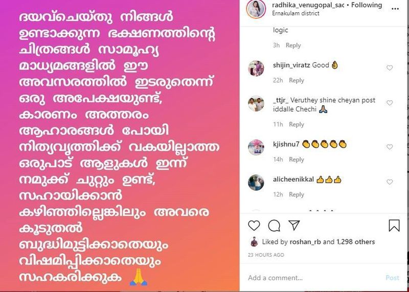 'ദയവ് ചെയ്തു നിങ്ങള് ഉണ്ടാക്കുന്ന ഭക്ഷണത്തിന്റെ ചിത്രങ്ങള് സമൂഹ മാധ്യമങ്ങളില് ഈ അവസരത്തില് ഇടരുതെന്ന് ഒരു അപേക്ഷയുണ്ട്. കാരണം അത്തരം ആഹാരങ്ങള് പോയി കഴിക്കാന് നിവൃത്തിയില്ലാതെ ഒരുപാട് ആളുകള് നമുക്ക് ഇടയില് ഇപ്പോള് ഉണ്ട് . സഹായിച്ചില്ലെങ്കിലും അവരെ കൂടുതല് ബുദ്ധിമുട്ടിക്കാതെയും, വിഷമിപ്പിക്കാതെയും സഹായിക്കുക'- എന്നായിരുന്നു സാധിക അടുത്തിടെ കുറിച്ചത്.