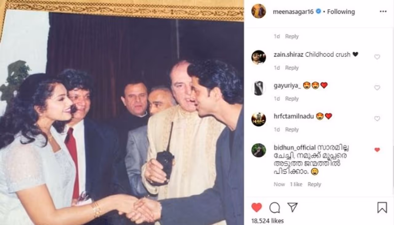 തന്റെ ഹൃദയം തകര്ന്ന നിമിഷം എന്നുപറഞ്ഞാണ് മീന ബോളിവുഡ് സൂപ്പര്സ്റ്റാര് ഹൃത്വിക്ക് റോഷന് കൈ കൊടുക്കുന്ന ചിത്രം പങ്കുവച്ചത്. തന്റെ ഹൃദയം തകര്ത്ത് സെലബ്രിറ്റിയാണ് ഹൃത്വിക്കെന്നാണ് മീന പറയുന്നത്. ബാംഗ്ലൂരില് വച്ചുനടന്ന ഹൃത്വിക്കിന്റെ വിവാഹ പാര്ട്ടിക്കിടെ എടുത്ത ചിത്രം പങ്കുവച്ചുകൊണ്ടായിരുന്നു മീനയുടെ കുറിപ്പ്. 'എന്റെ ഹൃദയം തകര്ന്ന ആ ദിവസം, എക്കാലത്തേയും എന്റെ പ്രിയപ്പെട്ട താരത്തെ അദ്ദേഹത്തിന്റെ വിവാഹ പാര്ട്ടിയില്വച്ച് കണ്ടപ്പോള്' എന്നുപറഞ്ഞാണ് ചിത്രം ഇന്സ്റ്റാഗ്രാമില് പങ്കുവച്ചത്.