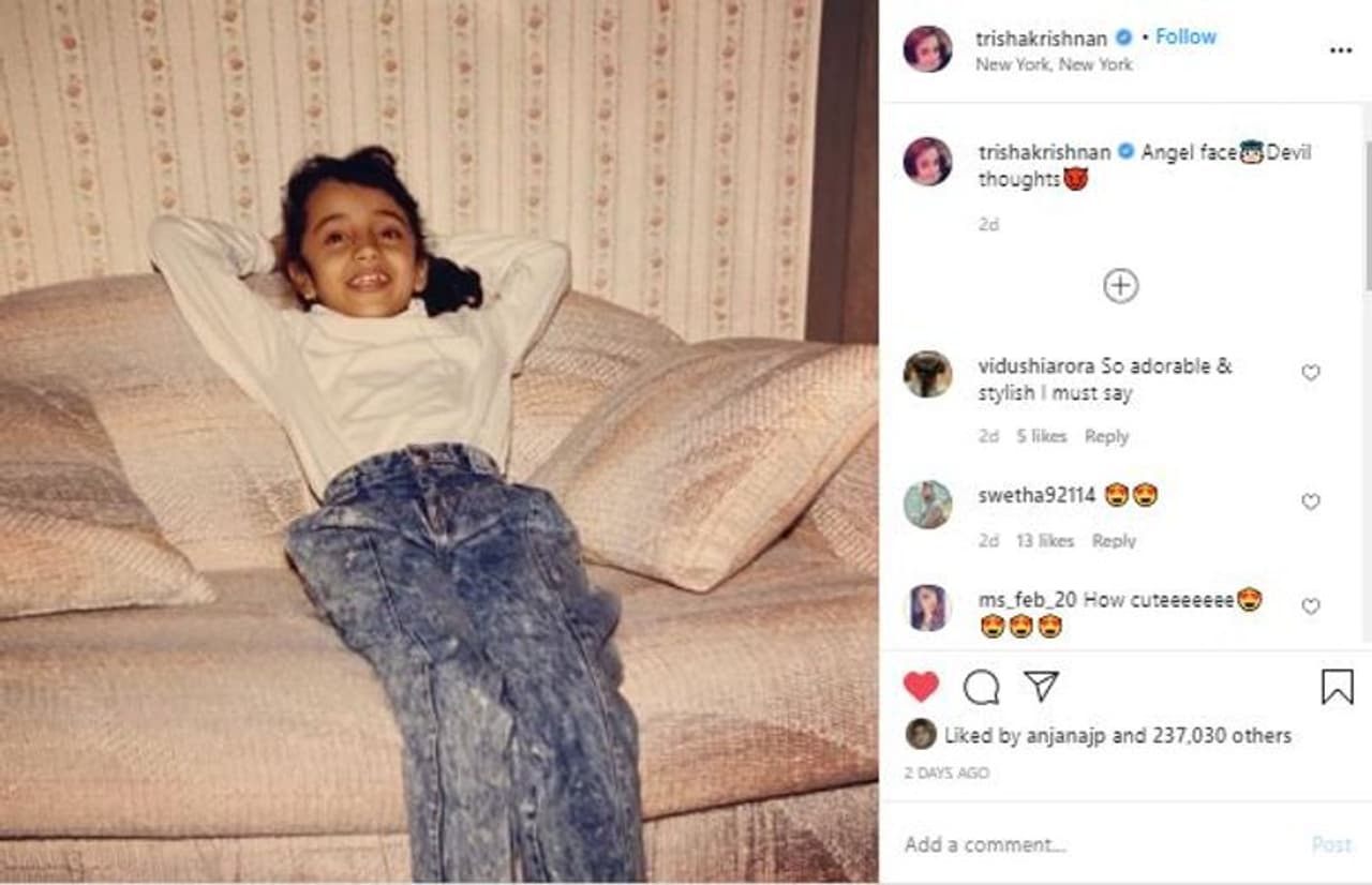 ജീന്സും ടോപ്പുമണിഞ്ഞ് കുസൃതിച്ചിരിയോടെ ക്യാമറയിലേക്ക് നോക്കുന്ന കുട്ടി തൃഷയാണ് ചിത്രത്തില്. 'മാലാഖയുടെ മുഖം, ചെകുത്താന്റെ ചിന്തകള്', എന്നാണ് ചിത്രത്തിന് തൃഷ നല്കിയിരിക്കുന്ന ക്യാപ്ഷന്. ചിത്രം രണ്ട് ലക്ഷത്തിലധികം ലൈക്കുകളാണ് ഇതിനകം നേടിയത്. തൃഷയും നടന് ചിമ്പുവും വിവാഹിതരാവാന് ഒരുങ്ങുന്നുവെന്ന് സ്ഥിരീകരിക്കാത്ത റിപ്പോര്ട്ടുകള് പുറത്തുവന്നതിനെ കുറിച്ചും ആരാധകർ ചോദിക്കുന്നുണ്ട്.
