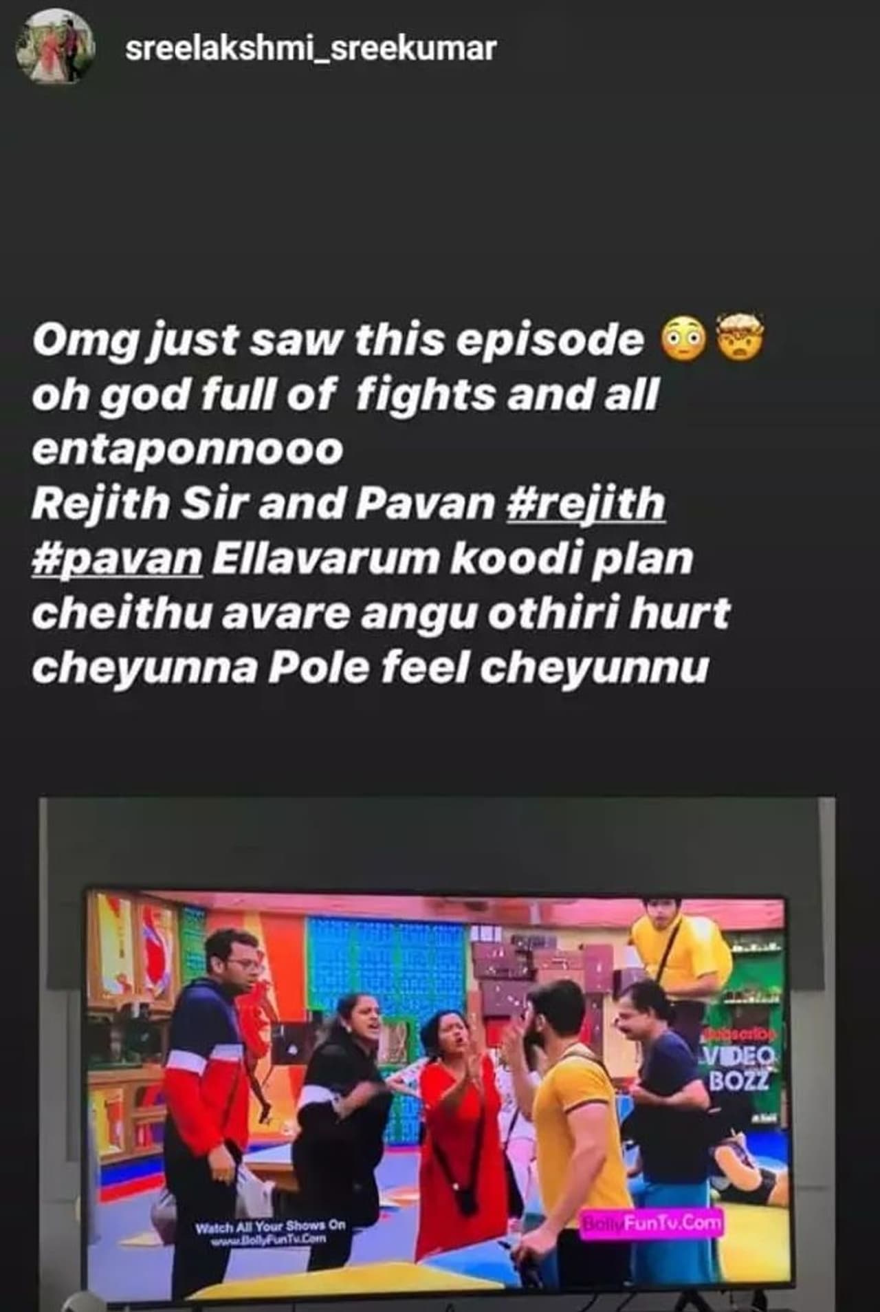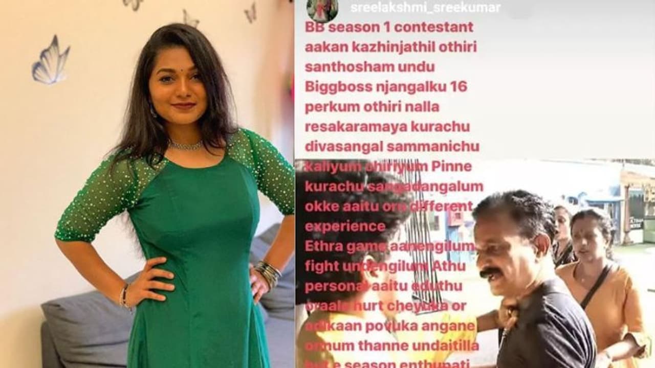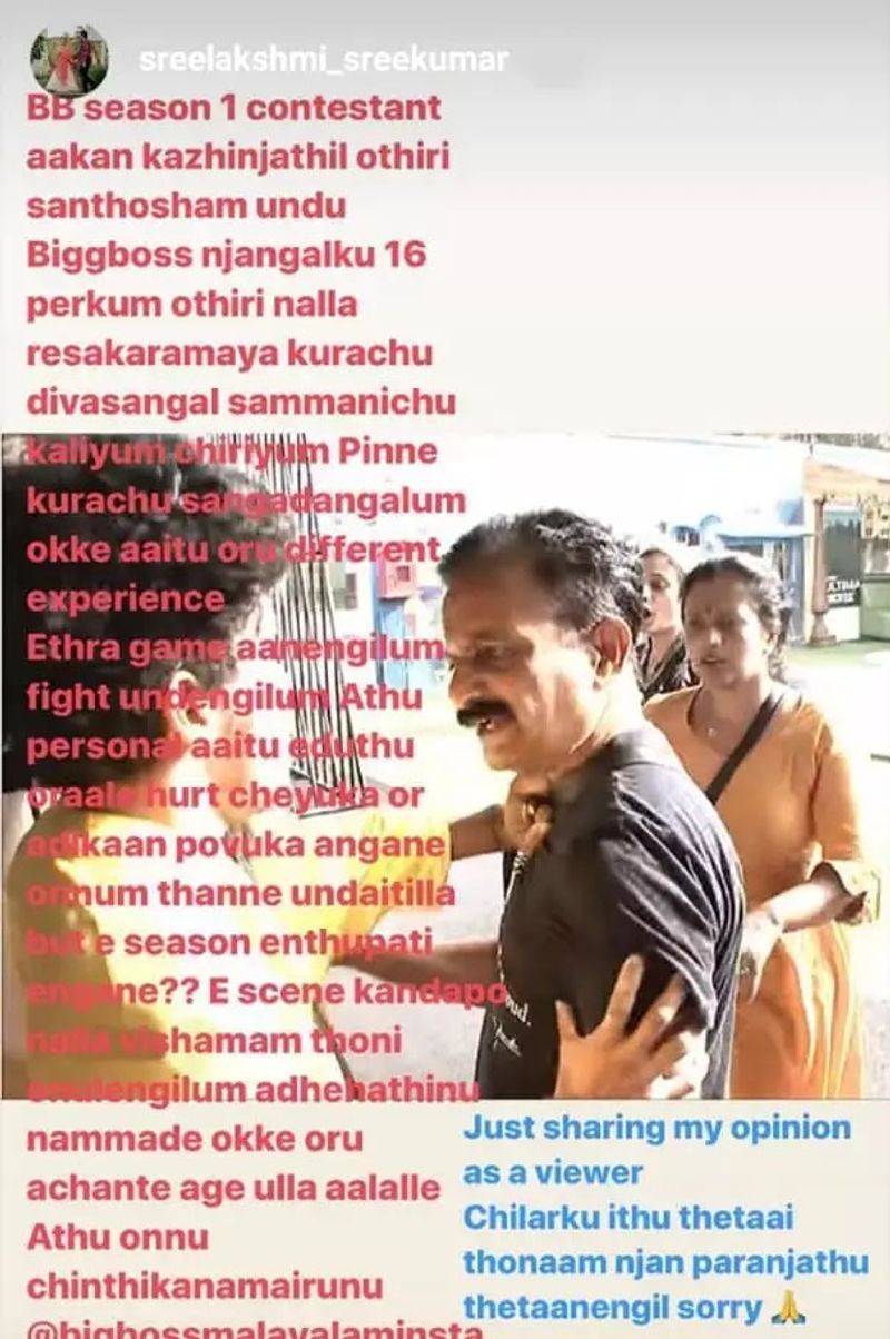 ' ബിഗ് ബോസ് സീസണ് ഒന്നില് പങ്കെടുക്കാന് സാധിച്ചതില് സന്തോഷമുണ്ട്. ബിഗ് ബോസ് ഞങ്ങളുടെ പതിനാറ് പേര്ക്കും ഒത്തിരി നല്ല രസകരമായ ദിവസങ്ങള് സമ്മാനിച്ചു. കളിയും ചിരിയും പിന്നെ കുറച്ച് സങ്കടങ്ങളും, അടി ഉണ്ടായിരുന്നെങ്കിലും അത് വ്യക്തിപരമായി എുടത്ത് ഒരാളെ ഹര്ട്ട് ചെയ്യുന്നതിലേക്കോ അടിക്കാന് പോകുന്നതിലേക്കോ എത്തിയിരുന്നില്ല. ഈ സീന് കണ്ടപ്പോ നല്ല വിഷമം തോന്നി. ഒന്നുമില്ലെങ്കിലും അദ്ദേഹത്തിന് നമ്മുടെയൊക്കെ അച്ഛന്റെ പ്രായമില്ലേ...'. ഈ കുറിപ്പിനൊപ്പം ഒന്നുകൂടി ശ്രീലക്ഷ്മി കുറിച്ചു, കാഴ്ചക്കാരി എന്ന നിലയില് എന്റെ അഭിപ്രായം മാത്രമാണ് പറഞ്ഞതെന്നും ചിലര്ക്ക്തെറ്റായി തോന്നാമെന്നും തെറ്റാണെങ്കില് ക്ഷമിക്കണമെന്നും ശ്രീലക്ഷ്മി പറയുന്നു