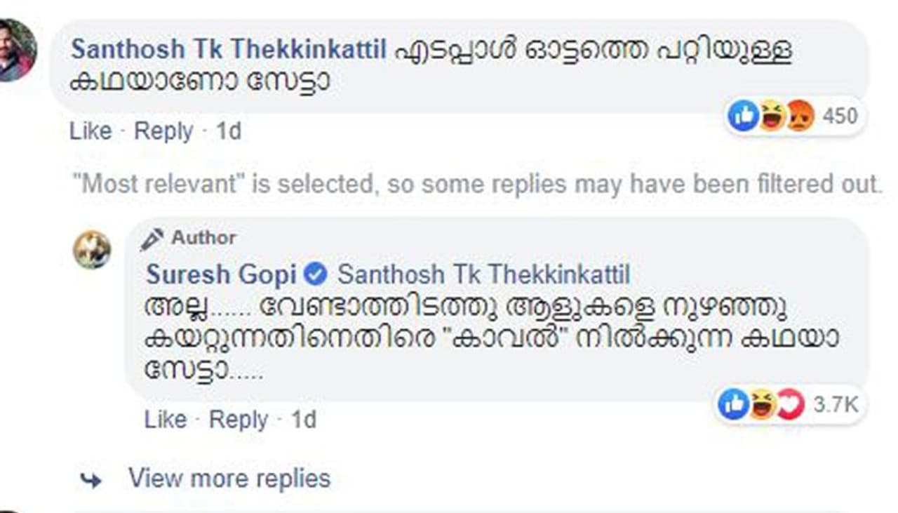 ഒരിടവേളയ്ക്ക് ശേഷം സുരേഷ് ഗോപി മലയാള സിനിമയില് സജീവമാവുകയാണ്. സത്യന് അന്തിക്കാടിന്റെ മകന് അനൂപ് സത്യന്റെ അരങ്ങേറ്റചിത്രം 'വരനെ ആവശ്യമുണ്ട്' പൂര്ത്തിയാക്കിയതിന് ശേഷം നിധിന് രണ്ജി പണിക്കരുടെ 'കാവലി'ല് ജോയിന് ചെയ്തിരിക്കുകയാണ് ഇപ്പോള് സുരേഷ് ഗോപി. കഴിഞ്ഞ ദിവസമാണ് ഈ സിനിമയുടെ ചിത്രീകരണം ആരംഭിച്ചത്. ചിത്രത്തിലെ ഒരു ലൊക്കേഷന് സ്റ്റില് പങ്കുവച്ചുകൊണ്ടാണ് 'കാവലി'ന്റെ ചിത്രീകരണം ആരംഭിച്ച വിവരം സുരേഷ് ഗോപി സോഷ്യല് മീഡിയയിലൂടെ ആരാധകരുമായി പങ്കുവച്ചത്. വലിയ പ്രതികരണം ലഭിച്ച ആ പോസ്റ്റില് സുരേഷ് ഗോപിക്ക് നേരെ ഒരു പരിഹാസച്ചോദ്യവും ഉയര്ന്നിരുന്നു. ആ ചോദ്യവും സുരേഷ് ഗോപി നല്കിയ മറുപടിയും ഫേസ്ബുക്കില് വൈറലായിട്ടുണ്ട്.