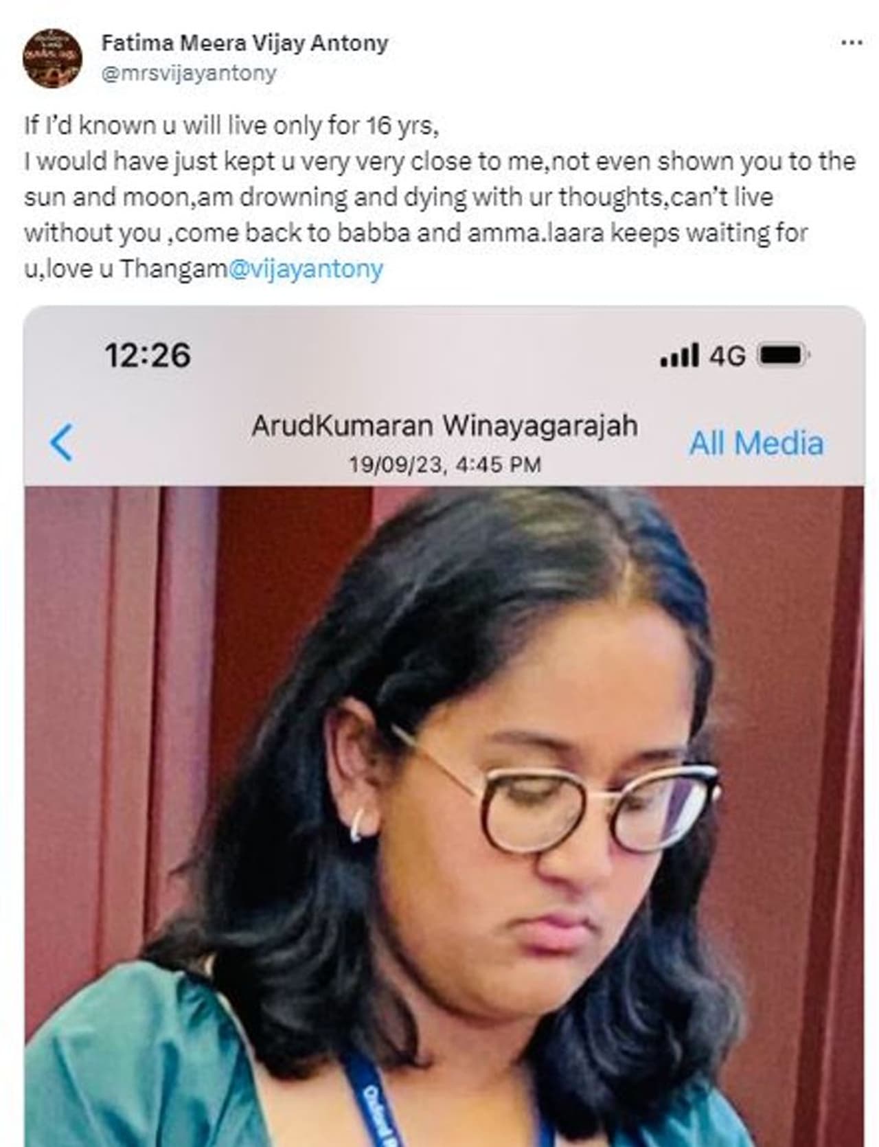 മകളുടെ മരണത്തിന് പത്ത് ദിവസത്തിന് ശേഷം തന്റെ പുതിയ ചിത്രത്തിന്റെ പ്രമോഷനാണ് താരം എത്തിയത്. ഇളയ മകള് ലാരയും അന്ന് വിജയിക്കൊപ്പം പ്രമോഷന് പരിപാടിയില് എത്തിയിരുന്നു. അന്ന് പലരും ചോദിച്ചത് വിജയ് ആന്റണിയുടെ ഭാര്യ ഫാത്തിമ എങ്ങനെ ഈ വിയോഗത്തെ എടുത്തിട്ടുണ്ടാകും എന്നാണ്. മകളുടെ വിയോഗത്തിന് ശേഷം ഇത് ആദ്യമായി സോഷ്യല് മീഡിയയില് ഫാത്തിമ ഇട്ട പോസ്റ്റാണ് ഇപ്പോള് ചര്ച്ചയാകുന്നത്.