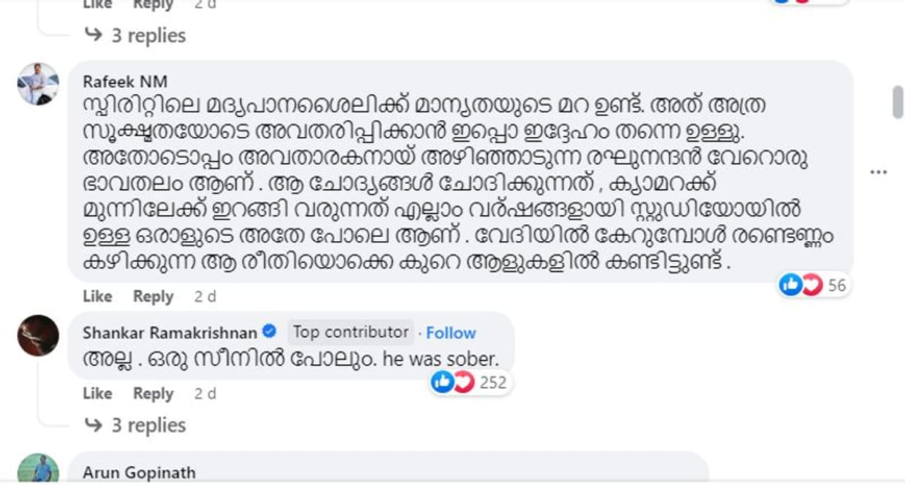 ഫേസ്ബുക്ക് സിനിമാപ്രേക്ഷക കൂട്ടായ്മയായ സിനിമാ പാരഡീസോ ക്ലബ്ബില് ഉണ്ണികൃഷ്ണന് ഇട്ട ഈ പോസ്റ്റിന് താഴെ ശങ്കര് രാമകൃഷ്ണന് കമന്റുമായി എത്തി. "അല്ല. ഒരു സീനില് പോലും. അദ്ദേഹം സമചിത്തതയോടെ തന്നെയാണ് അഭിനയിച്ചത്", ശങ്കര് രാമകൃഷ്ണന് കമന്റ് ബോക്സില് കുറിച്ചു.