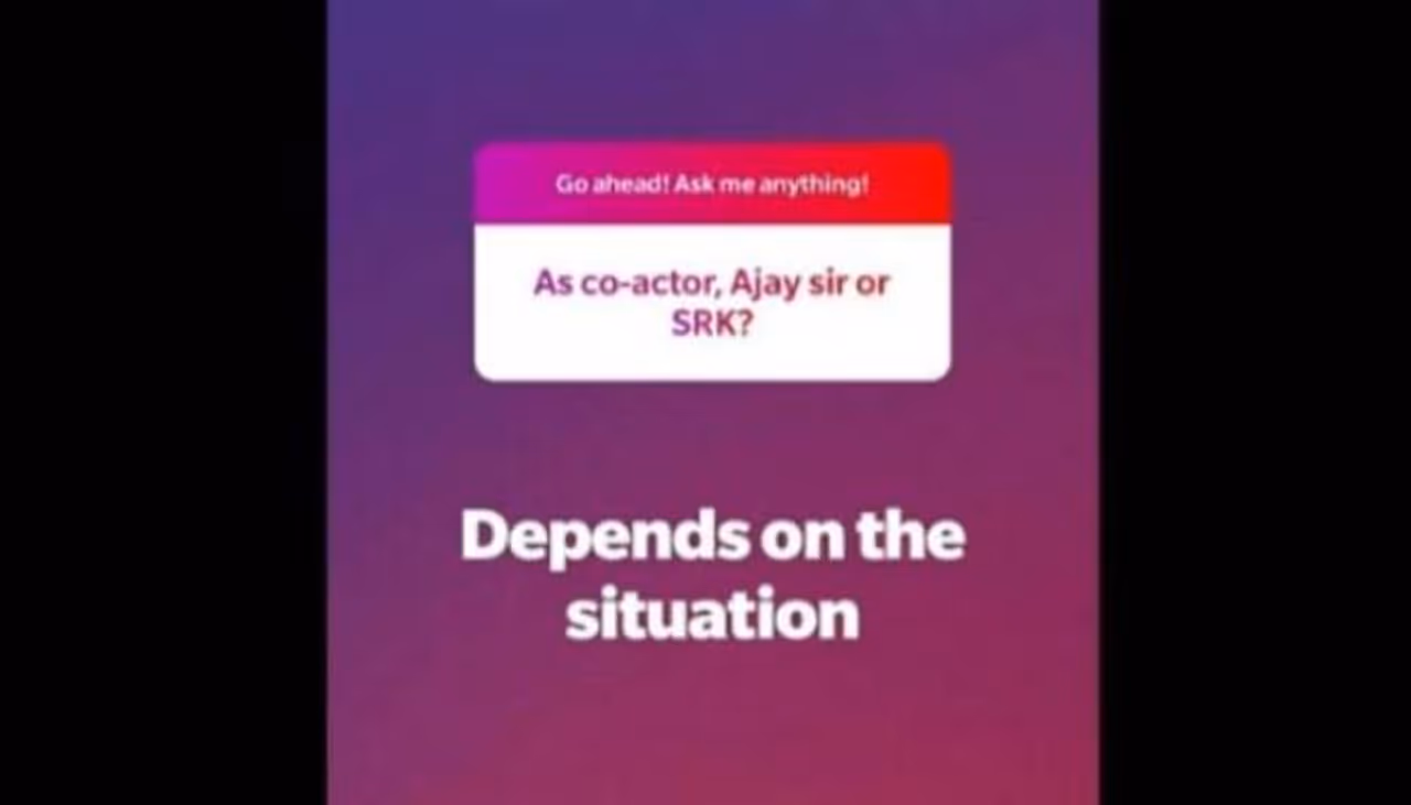'അജയ് ദേവ്ഗണിനെ കണ്ടില്ലായിരുന്നെങ്കിൽ ഷാരൂഖ് ഖാനെ വിവാഹം ചെയ്യുമായിരുന്നോ' എന്നായിരുന്നു ഒരു ഇൻസ്റ്റഗ്രാം ഉപയോക്തവിന്റെ ചോദ്യം.