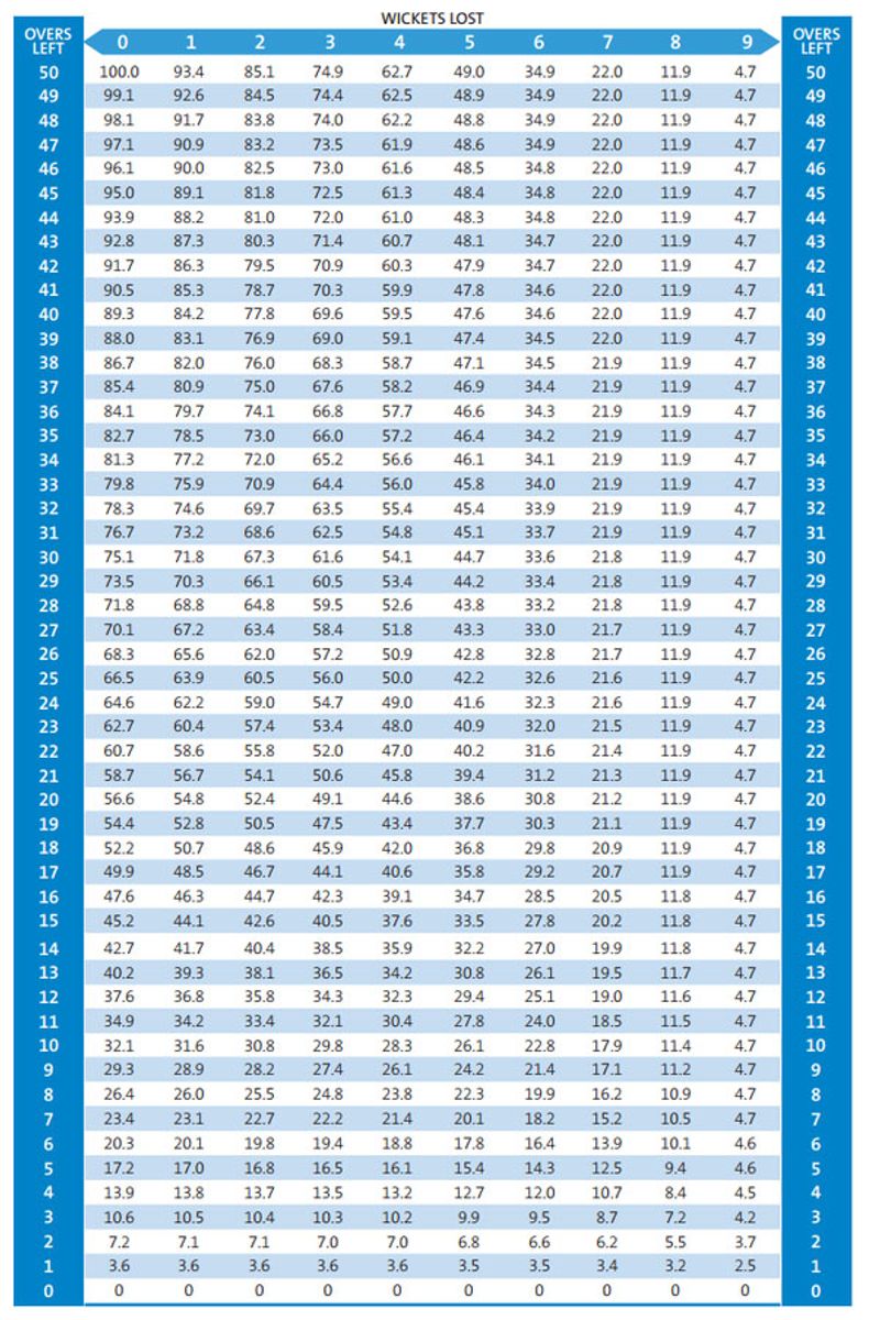 നഷ്ടപ്പെട്ട വിക്കറ്റുകളുടെയും അവശേഷിക്കുന്ന ഓവറുകളുടെയും ഒരു ടേബിൾ ആണ് ഈ നിയമത്തിന്റെ അടിസ്ഥാന രേഖ. ഒന്നാം ഇന്നിങ്സിൽ സ്കോർ ചെയ്യപ്പെട്ട റൺസിന്റെ ഇത്ര ശതമാനം എന്ന രീതിയിൽ ഈ ടേബിളിൽ നിന്നും മഴയുടെ ഇടപെടലിന് ശേഷമുള്ള ലക്ഷ്യം കണ്ടെത്താം. ഈ ശതമാനക്കണക്ക് കണ്ടെത്തുന്നത് വളരെ സങ്കീർണ്ണമായ ഒരു സ്റ്റാറ്റിസ്റ്റിക്സ് സമീപനത്തിലൂടെയാണ് എന്നുമാത്രം. ഇന്നിങ്സുകൾക്കിടയിലെ ഇടവേളയിൽ ഈ ടേബിൾ തയ്യാറാക്കപ്പെടും. ഈ നിയമത്തെ മെച്ചപ്പെടുത്തുന്നതിന്റെ ഭാഗമായി ആ പ്രക്രിയയിൽ കളിയെ സ്വാധീനിക്കുന്ന പല ഘടകങ്ങളെയും പരിഗണിക്കുന്നുണ്ട്.