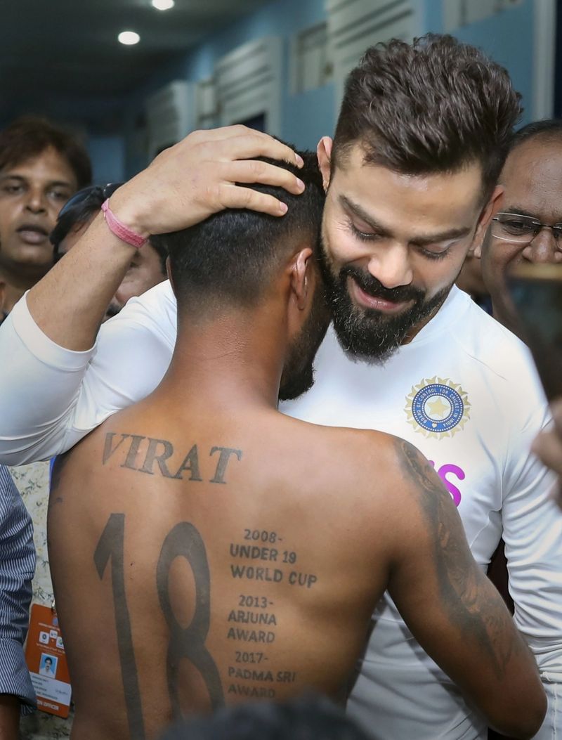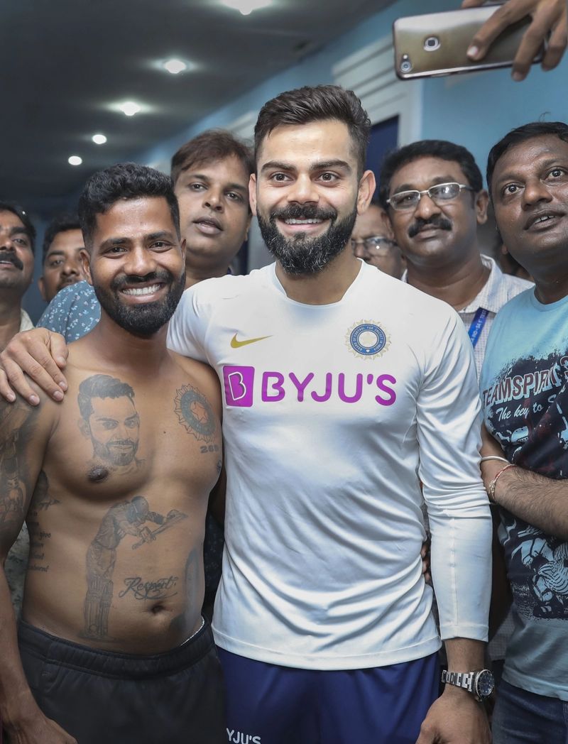 വാര്ത്താസമ്മേളനത്തിനുശേഷം പതിവുപോലെ തനിക്കൊപ്പം നിന്ന് ഫോട്ടോ എടുക്കാനെത്തിയ ആരാധകനാണ് പിന്റുവെന്നായിരുന്നു കോലി ആദ്യം കരുതിയത്. എന്നാല് പിന്റുവിന്റെ കോലി ആരാധാന അറിയാവുന്ന ഒരു മാധ്യമപ്രവര്ത്തകന് അദ്ദേഹത്തോട് ഷര്ട്ടൂരാന് പറയുകയായിരുന്നു. ഷര്ട്ടൂരിയപ്പോഴാണ് പിന്റുവിന് തന്നോടുള്ള ആരാധന കോലിക്ക് ശരിക്കും മനസിലായത്. നെഞ്ചില് കോലിയുടെ മുഖം പച്ചകുത്തിയ ടിന്റു മുതുകില് കോലിയുടെ ജേഴ്സി നമ്പറായ 18 എന്ന് വലുപ്പത്തില് ടാറ്റൂ ചെയ്തിരുന്നു, തീര്ന്നില്ല കോലിയുടെ കരിയറിലെ പ്രധാന നേട്ടങ്ങളെല്ലാം മുതകില് ടാറ്റൂ ചെയ്തിട്ടുണ്ട്.