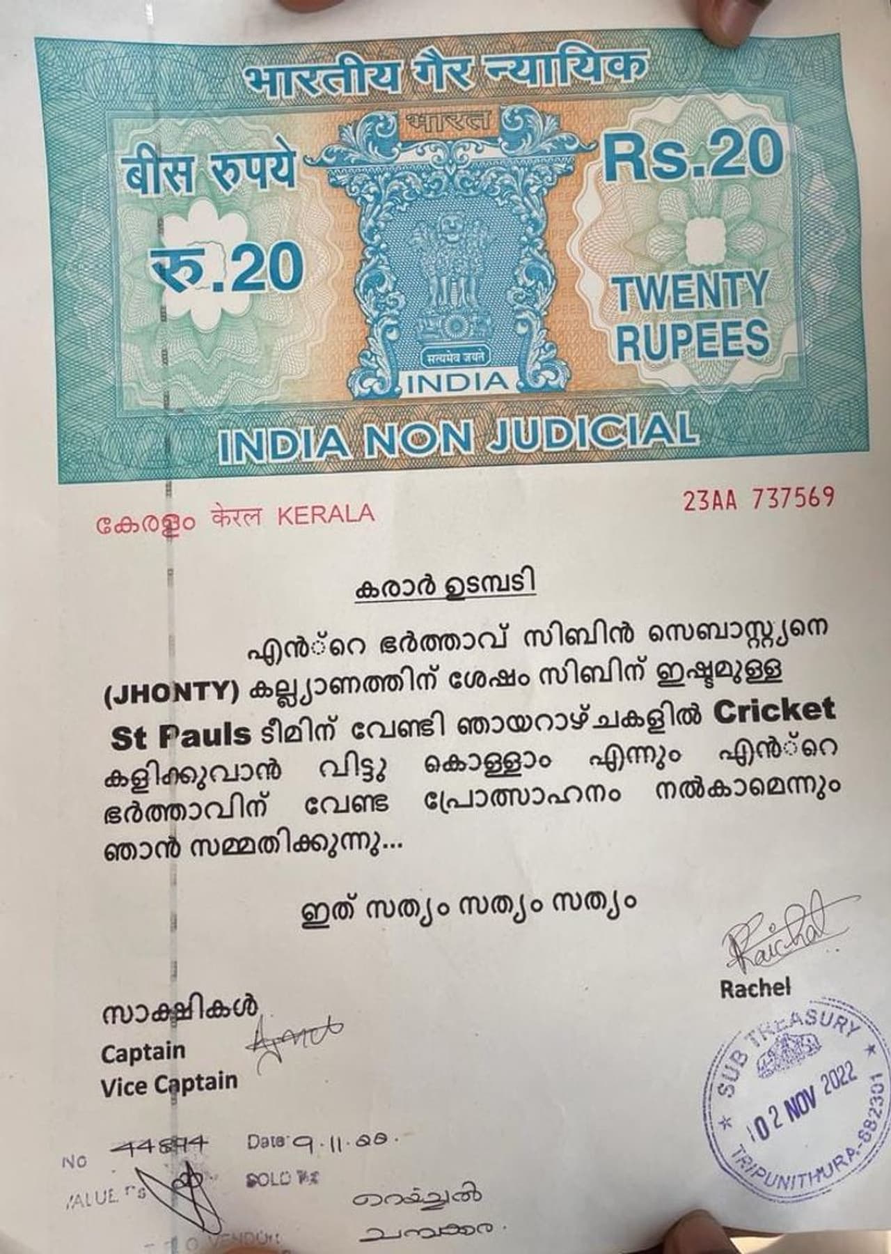 എന്റെ ഭര്ത്താവ് സിബിന് സെബാസ്റ്റ്യനെ(JHONTY) കല്യാണത്തിന് ശേഷം സിബിന് ഇഷ്ടമുള്ള St Pauls ടീമിന് വേണ്ടി ഞായറാഴ്ചകളില് Cricket കളിക്കുവാന് വിട്ടുകൊള്ളാം എന്നും എന്റെ ഭര്ത്താവിന് വേണ്ട പ്രോത്സാഹനം നല്കാമെന്നും ഞാന് സമ്മതിക്കുന്നു. ഇത് സത്യം സത്യം സത്യം- എന്നാണ് കരാര് ഉടമ്പടിയിലുള്ളത്. സെന്റ് പോള്സ് ടീമിന്റെ ക്യാപ്റ്റനും വൈസ് ക്യാപ്റ്റനുമാണ് ഇതിന് സാക്ഷികളായി ഒപ്പ് വച്ചിട്ടുള്ളത്.