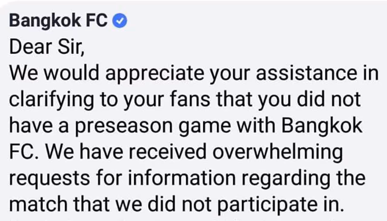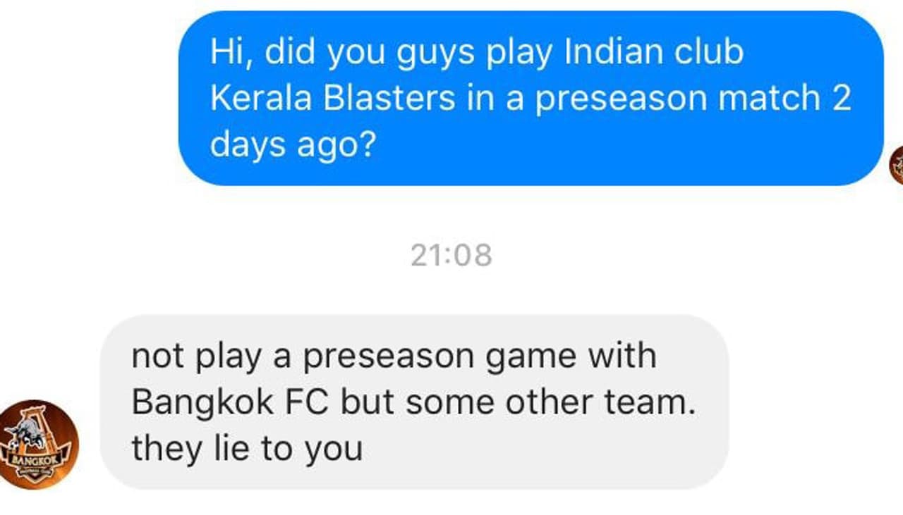 എന്നാല് തങ്ങള് അങ്ങനെ ഒരു മത്സരം കളിച്ചിട്ടില്ലെന്ന് ബാങ്കോക്ക് എഫ്സി വ്യക്തമാക്കി. കേരള ബ്ലാസ്റ്റേഴ്സ് ഫെസ്ബുക്ക് പേജിന്റെ വാളിലാണ് ബാങ്കോക്ക് എഫ്സി അധികൃതര് ഇക്കാര്യം പോസ്റ്റ് ചെയ്തിരിക്കുന്നത്. പിന്നാലെ ബ്ലാസ്റ്റേഴ്സ് അധികൃതര് മത്സരത്തിന്റെ ഫലം പേജില് നിന്ന് കളയുകയും ചെയ്തു. ഫലങ്ങളില് തങ്ങളുടെ ലോഗോ ഉപയോഗിക്കുന്നത് തെറ്റാണെന്നും സന്ദേശത്തില് ബാങ്കോക്ക് എഫ്സി പോസ്റ്റില് പറയുന്നു.
