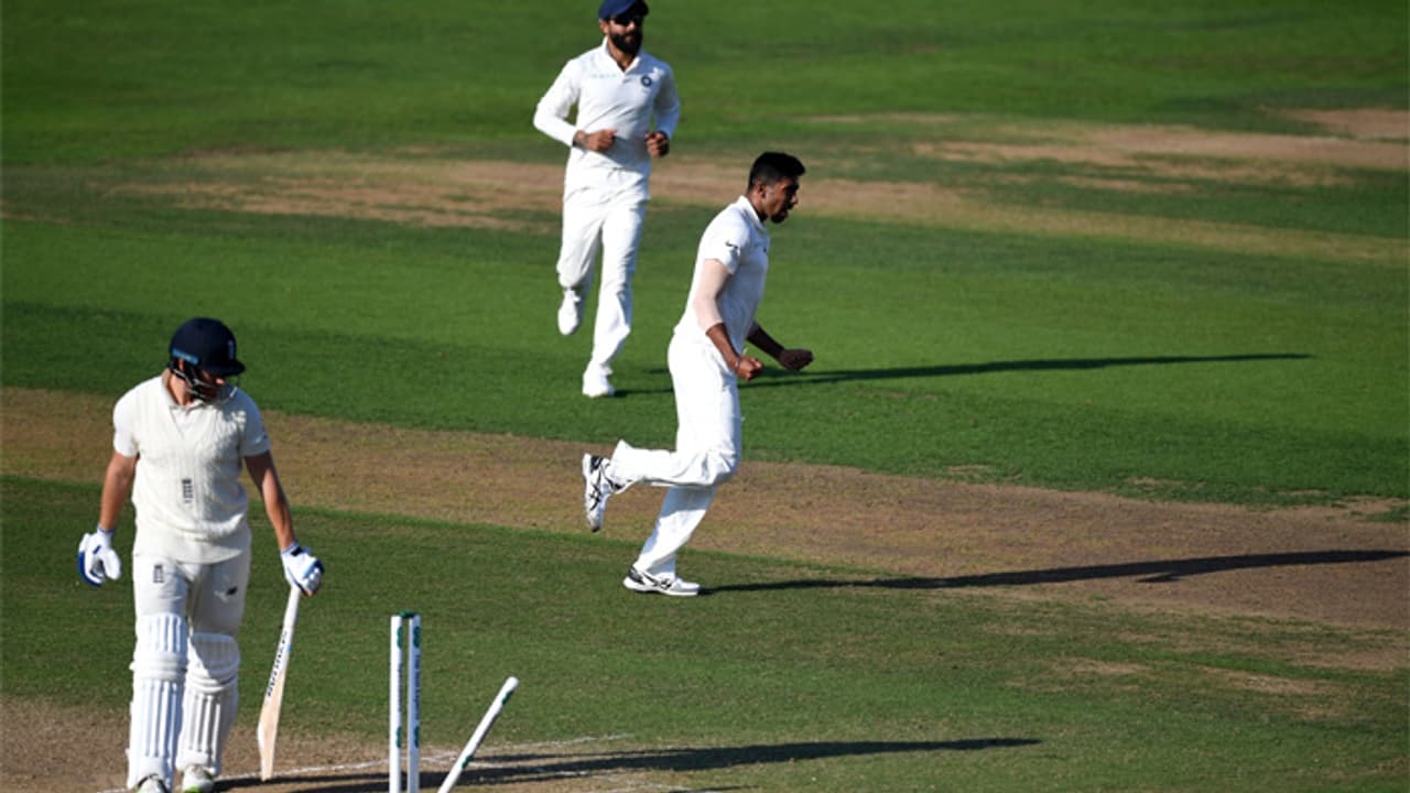 ഇശാന്ത് ശര്മയാണ് തകര്ച്ചയ്ക്ക് തുടക്കമിട്ടത്. സ്കോര് 27ല് നില്ക്കെ 13 റണ്സെടുത്ത കീറ്റണ് ജെന്നിങ്സിനെ ഇശാന്ത് വിക്കറ്റ് കീപ്പര് ഋഷഭ് പന്തിന്റെ കൈകളിലെത്തിച്ചു. പിന്നാലെ അലിസ്റ്റര് കുക്കിനേയും ഇശാന്ത് മടക്കി അയച്ചു. സ്ലിപ്പില് കെ.എല്. രാഹുല് ക്യാച്ചെടുത്തു. അടുത്തത് ജോ റൂട്ടിന്റെ ഊഴമായിരുന്നു.