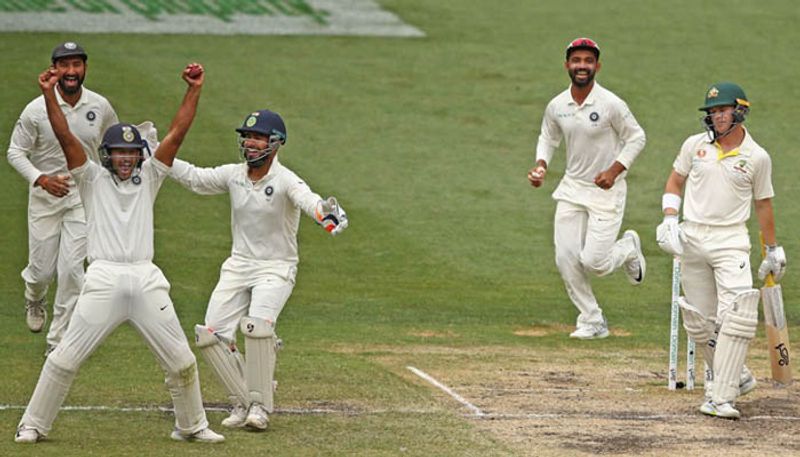 വന് തകര്ച്ചയാണ് ഇന്ത്യ രണ്ടാം ഇന്നിങ്സില് നേരിട്ടത്. ഓപ്പണര്മാര് തുടക്കത്തില് 28 റണ്സ് കൂട്ടിച്ചേര്ത്തു. എന്നാല് അടുത്ത് നാല് റണ്സ് കൂട്ടിച്ചേര്ക്കുന്നതിനിടെ ഇന്ത്യക്ക് നാല് വിക്കറ്റുകള് നഷ്ടമായി. ഹനുമ വിഹാരി(13), ചേതേശ്വര് പൂജാര(0), വിരാട് കോലി(0), അജിന്ക്യ രഹാനെ(1) എന്നിവരുടെ വിക്കറ്റുകളാണ് ഇന്ത്യക്ക് നാല് റണ്സെടുക്കുന്നതിനിടെ നഷ്ടമായത്. പാറ്റ് കമ്മിന്സാണ് നാലും വിക്കറ്റും വീഴ്ത്തിയത്. രോഹിത് ശര്മ (5) പിടിച്ചു നില്ക്കാന് ശ്രമിച്ചെങ്കിലും ഹേസല്വുഡിന്റെ പന്ത് കട്ട് ഷോട്ടിന് ശ്രമിക്കുന്നതിനിടെ ടിം പെയ്നിന് ക്യാച്ച് നല്കി മടങ്ങി. നേരത്തെ, വിഹാരിയെ കമ്മിന്സ് സ്ലിപ്പില് ഖവാജയുടെ കൈകളിലെത്തിച്ചപ്പോള് കോലിയും പൂജാരയും സമാനമായ ഷോട്ടുകളില് ഷോര്ട്ട് ഫൈന് ലെഗ്ഗില് ഹാരിസിന് ക്യാച്ച് നല്കി മടങ്ങി. രഹാനെ കമ്മിന്സിന്റെ പന്തില് ടിം പെയ്നിന് പിടികൊടുത്തു.