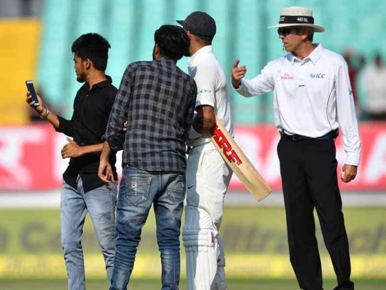 ക്രീസില് നില്ക്കുകയായിരുന്ന കോലിക്ക് അടുത്തെത്തിയ രണ്ടുപേരും യാതൊരു കൂസലുമില്ലാതെ മൊബൈല് എടുത്ത് കോലിക്കൊപ്പം സെല്ഫി എടുത്തു. ഇന്ത്യന് ക്യാപ്റ്റനൊപ്പം സെല്ഫിയെടുക്കാന് ലഭിച്ച അവസരം യുവ ആരാധകര് ശരിക്കും ആസ്വദിച്ചു.