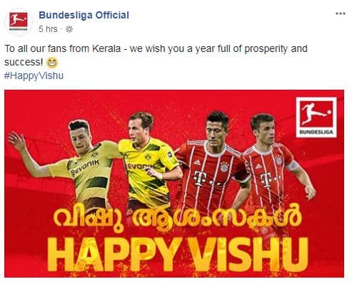 ജര്‍മന്‍ ഫുട്‌ബോള്‍ ലീഗായായ ബുണ്ടസ്‌ലിഗയാണ് മലയാളികള്‍ക്ക് വിഷു അശംസകള്‍ അറിയിച്ചത്.