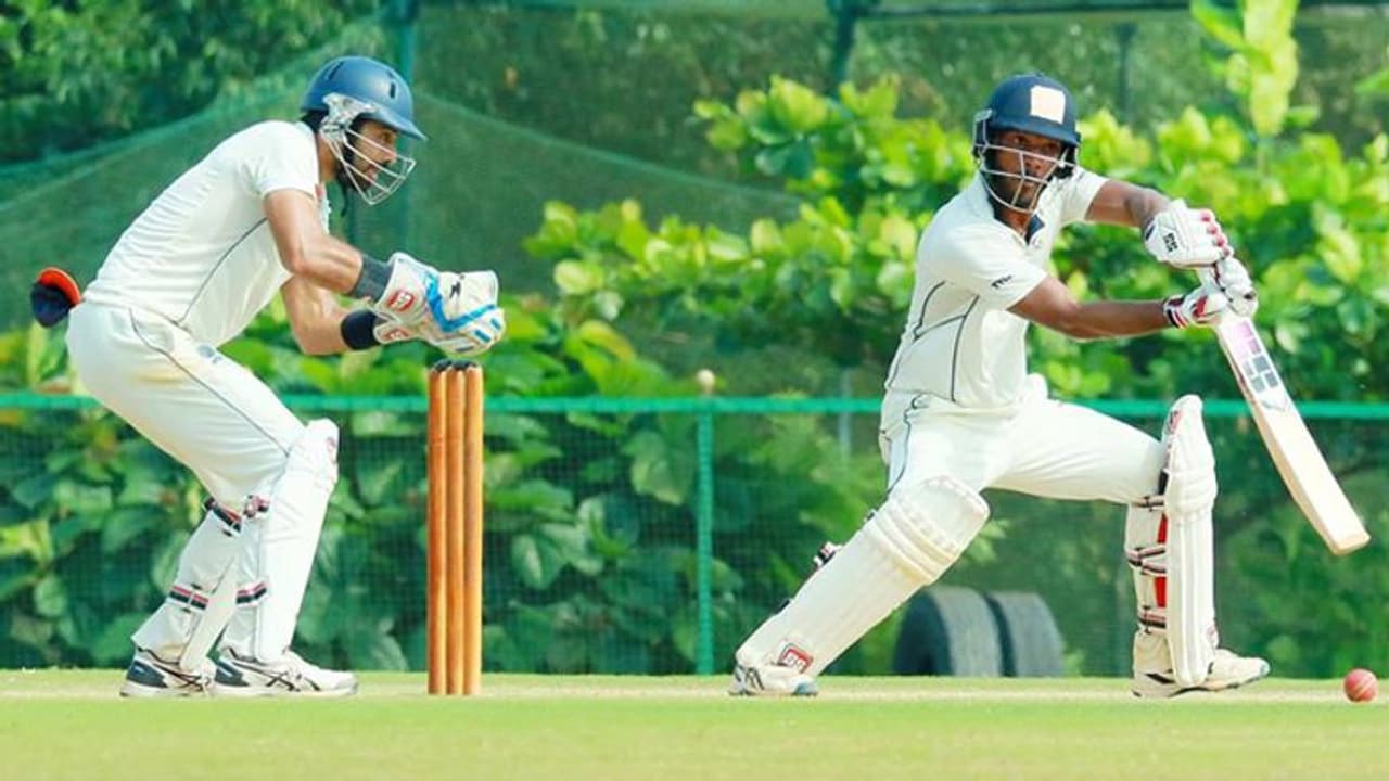 നേരത്തെ, രണ്ടാം ഇന്നിങ്സില് കേരളം 455 റണ്സിന് എല്ലാവരും പുറത്തായി. 193 റണ്സുമായി വിഷ്ണു വിനോദ് പുറത്താവാതെ നിന്നും. ബേസില് തമ്പി 57 റണ്സ് നേടി. അടുത്തടുത്ത പന്തുകളില് ബേസില് തമ്പിയും സന്ദീപ് വാര്യരും പുറത്തായതാണ്് വിഷ്ണുവിന് അര്ഹിച്ച ഇരട്ട സെഞ്ചുറി നിഷേധിച്ചത്. 282 പന്തില് ഒരു സിക്സിന്റേയും 23 ഫോറിന്റേയും സഹായത്തോടെയാണ് വിഷ്ണു വിനോദ് 193 റണ്സെടുത്തത്. 107 പന്തില് രണ്ട് സിക്സിന്റേയും എട്ട് ഫോറിന്റെയും സഹായത്തോടെയാണ് ബേസില് അര്ധ സെഞ്ചുറി നേടിയത്. ഒമ്പതാം വിക്കറ്റില് 131 റണ്സാണ് ബേസില് തമ്പി- വിഷ്ണു വിനോദ് സഖ്യം കൂട്ടിച്ചേര്ത്തത്. നേരത്തെ ക്യാപ്റ്റന് സച്ചിന് ബേബിയും സെഞ്ചുറി നേടിയിരുന്നു. 211 പന്തില് 14 ബൗണ്ടറിയും മൂന്നു സിക്സും സഹിതമാണ് സച്ചിന് ബേബി 143 റണ്സെടുത്തിരുന്നത്.