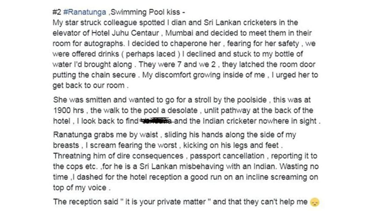 ഭയന്ന താന് രക്ഷപെടാനായി രണതുംഗയുടെ കാലില് ആഞ്ഞുചവിട്ടിയെന്നും യുവതി പറയുന്നു. സംഭവം ഹോട്ടല് റിസപ്ഷനില് അറിയിച്ചെങ്കിലും നടപടിയുണ്ടായില്ലെന്നും വെളിപ്പെടുത്തലിലുണ്ട്. എന്നാല് യുവതി ഫേസ്ബുക്കിലൂടെ നടത്തിയ വെളിപ്പെടുത്തലില് സംഭവം നടന്ന തിയതി സൂചിപ്പിച്ചിട്ടില്ല. ലങ്കയ്ക്ക് 1996 ലോകകപ്പ് നേടിക്കൊടുത്ത നായകനാണ് രണതുംഗ. 18 വര്ഷം നീണ്ട ക്രിക്കറ്റ് കരിയറില് 93 ടെസ്റ്റുകളില് 5105 റണ്സും 296 ഏകദിനങ്ങളില് 7456 റണ്സും നേടിയിട്ടുണ്ട്. ക്രിക്കറ്റില് നിന്ന് വിരമിച്ചശേഷം രാഷ്ട്രീയത്തിലേക്ക് ഇറങ്ങിയ രണതുംഗ ഇപ്പോള് ശ്രീലങ്കയിലെ പെട്രോളിയം വിഭവശേഷി വികസനമന്ത്രിയാണ്.