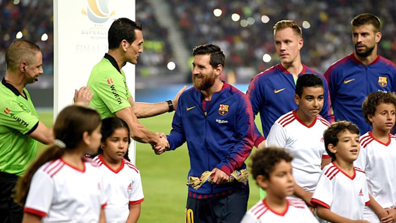 ബാഴ്സലോണ: സ്പാനിഷ് സൂപ്പര് കോപ്പ കിരീടത്തോടെ മെസി ക്യാപ്റ്റനായുള്ള അരങ്ങേറ്റവും ഗംഭീരമാക്കി. പുതിയ സീസണില് മെസി ബാഴ്സലോണയെ നയിക്കുമെന്ന് മാനേജ്മെന്റ് അറിയിച്ചിരുന്നു. ബാഴ്സലോണയില് അരങ്ങേറി 13 വര്ഷങ്ങള്ക്ക് ശേഷമാണ് മെസി ടീമിന്റെ ഫസ്റ്റ് ക്യാപ്റ്റനാകുന്നത്. അരങ്ങേറ്റം ട്രോഫിയോടെ തന്നെ.