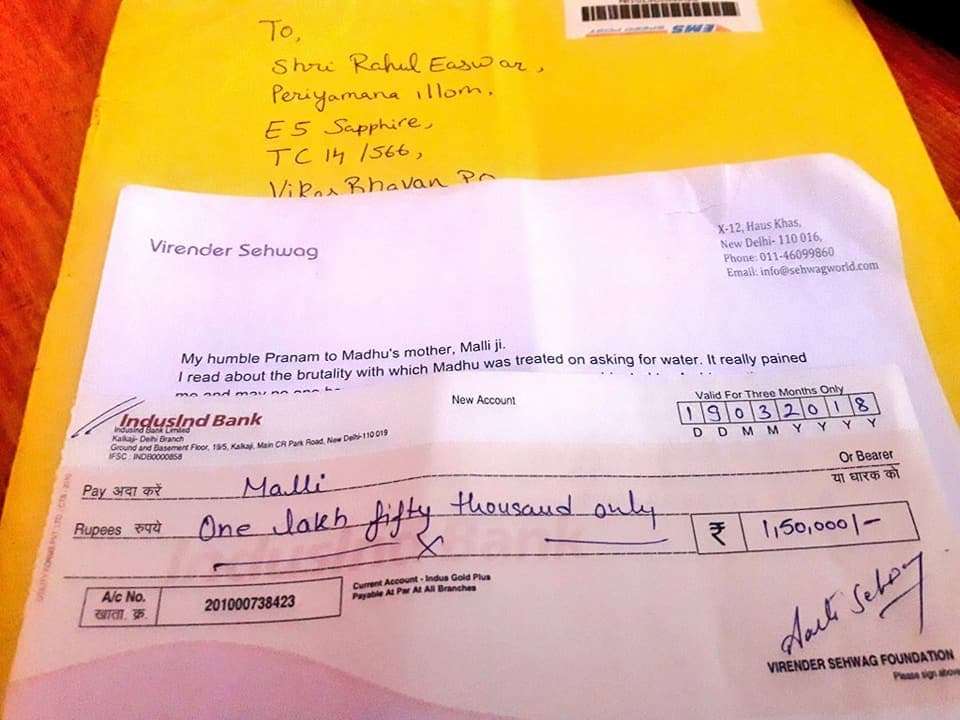 . നിങ്ങളുടെ മകന്‍ മധു ക്രൂരമായി കൊല്ലപ്പെട്ടതില്‍ തനിക്ക് വേദനയുണ്ടെന്നും ചെക്കിനോടൊപ്പം അയച്ച കത്തില്‍ സെവാഗ് വ്യക്തമക്കുന്നുണ്ട്.