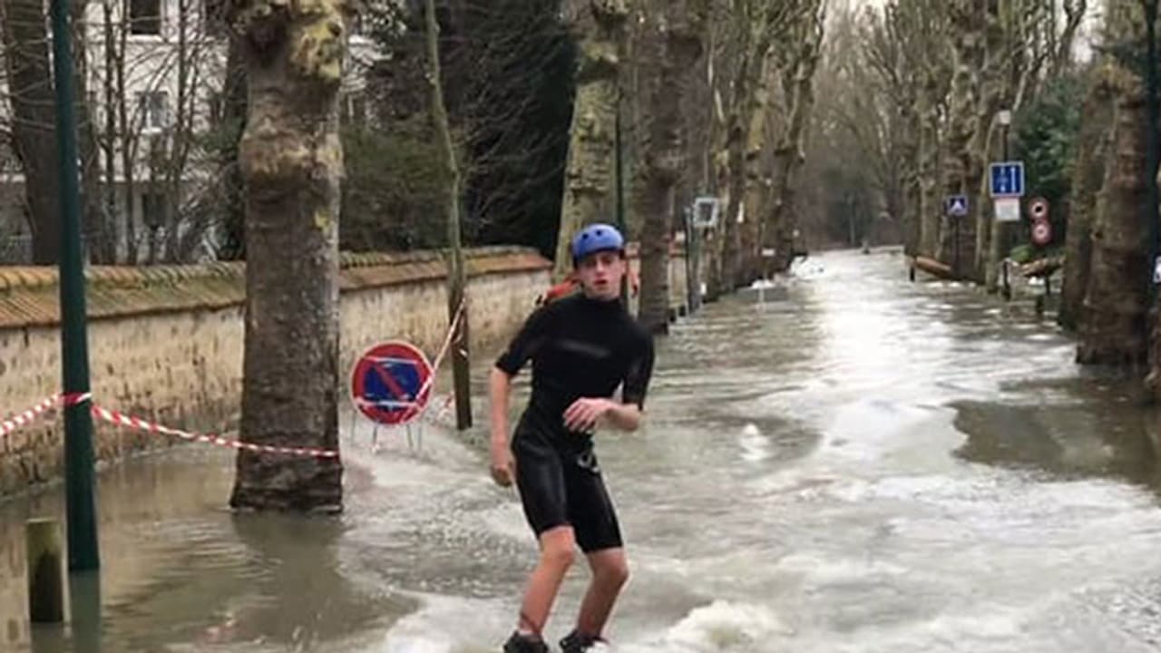 വെള്ളം നിറഞ്ഞ പാരിസ് തെരുവിലൂടെ വേക്ക് ബോര്ഡില് പരിശീലനം നടത്തുന്ന കൗമാരക്കാരുടെ വീഡിയോ വൈറലായിക്കഴിഞ്ഞു. നിരവധി പേരാണ് വേക്ക് ബോര്ഡില് പാരിസ് നഗരത്തില് പരിശീലനത്തിലും അഭ്യാസങ്ങളിലും ഏര്പ്പെട്ടിരിക്കുന്നത്. കൈയില് ബന്ധിപ്പിച്ചിരിക്കുന്ന കേബിളിന്റെ സഹായത്തോടെയാണ് അനായാസം ഇവര് ജലത്തിലൂടെ തെന്നിനിങ്ങുന്നത്.