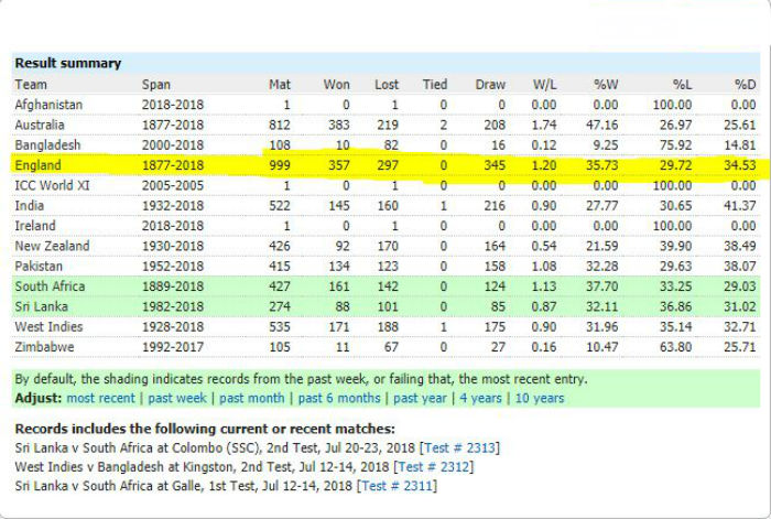 1877 മാർച്ചിൽ ഓസ്ട്രേലിയയ്ക്കെതിരെ ആദ്യ ടെസ്റ്റ് കളിച്ച ഇംഗ്ലണ്ട് ഇതുവരെ 999 ടെസ്റ്റുകളിൽ കളിച്ചു. ഇതില് 357 ജയവും 297 തോല്വിയും 345 സമനിലയും നേടി.
