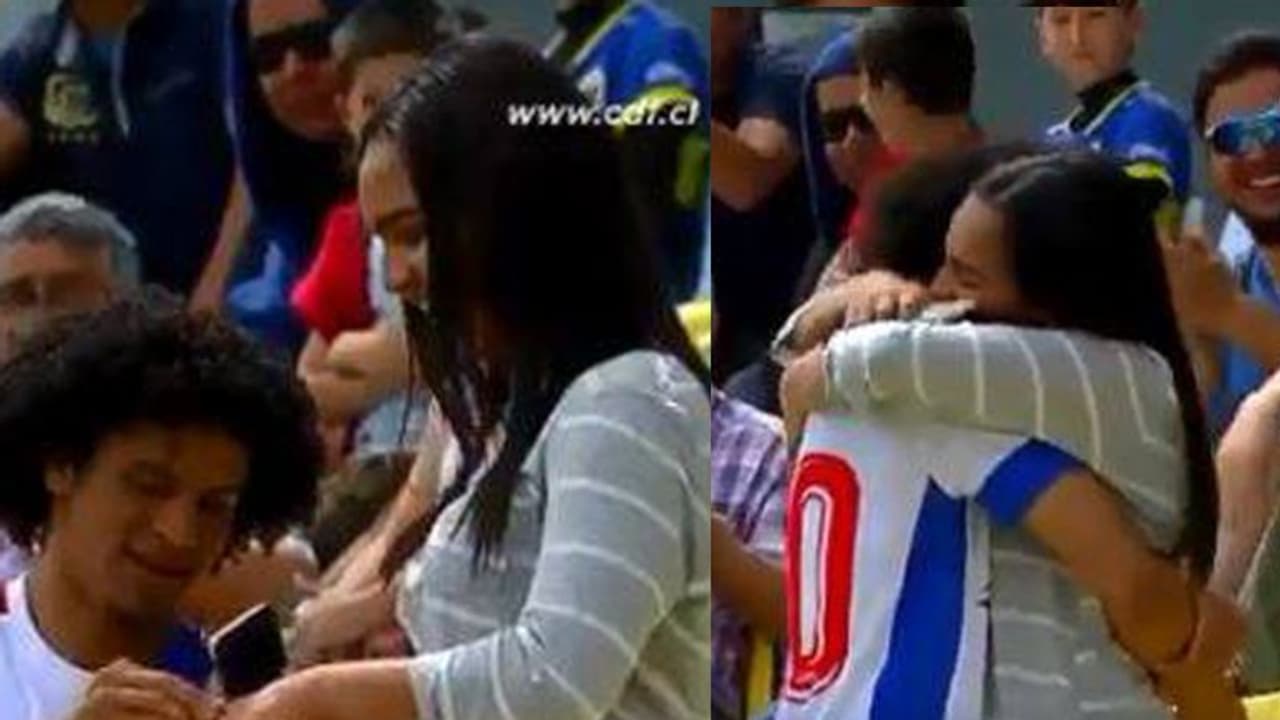 സാന്റിയാഗോ: ഫുട്ബോള് മത്സരങ്ങള്ക്കിടെ പ്രണയവും പ്രണയാഭ്യര്ത്ഥനകളും പൊട്ടിവിടരുന്നത് മുന്പ് നമ്മള് കണ്ടിട്ടുണ്ട്. ചിലിയില് നടന്ന ഒരു ഫുട്ബോള് മത്സരത്തിനിടെയും ഇത്തരമൊരു സംഭവമുണ്ടായി. ഇവിടെ ഒരു ഗോളാഘോഷമാണ് കാമുകിയ പ്രൊപ്പോസ് ചെയ്യുന്നതിലും ചുംബിച്ച് ആലിംഗനം ചെയ്യുന്നതിലും അവസാനിച്ചത്.