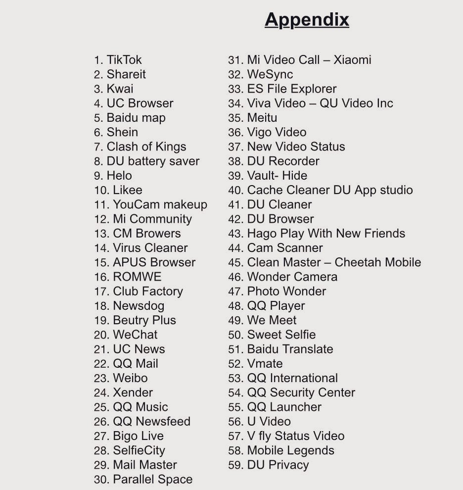 നിരോധിച്ച ആപ്ലിക്കേഷനുകളുടെ പട്ടിക ഇങ്ങനെയാണ്: