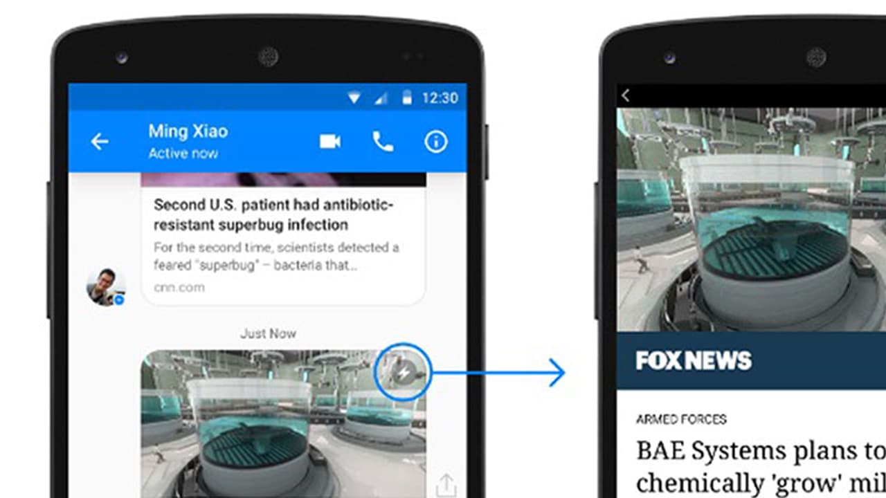 അതിനിടയിലാണ് ഇന്സ്റ്റന്റ് ആര്ട്ടിക്കിള് എന്ന സൗകര്യം തങ്ങളുടെ സന്ദേശ ആപ്പ് ആയ ഫേസ്ബുക്ക് മെസഞ്ചറിലേക്ക് ഫേസ്ബുക്ക് വ്യാപിക്കുന്നത്. ഏതെങ്കിലും ഒരു ഉപയോക്താവ് മറ്റൊരു ഉപയോക്താവിന് ഇന്സ്റ്റന്റ് ആര്ട്ടിക്കിള് ഷെയര് ചെയ്താല് മെസഞ്ചറില് നിന്നും പുറത്തുപോകാതെ തന്നെ അത് വായിക്കുവാന് സാധിക്കും എന്നതാണ് ഇതിന്റെ പ്രത്യേകത.