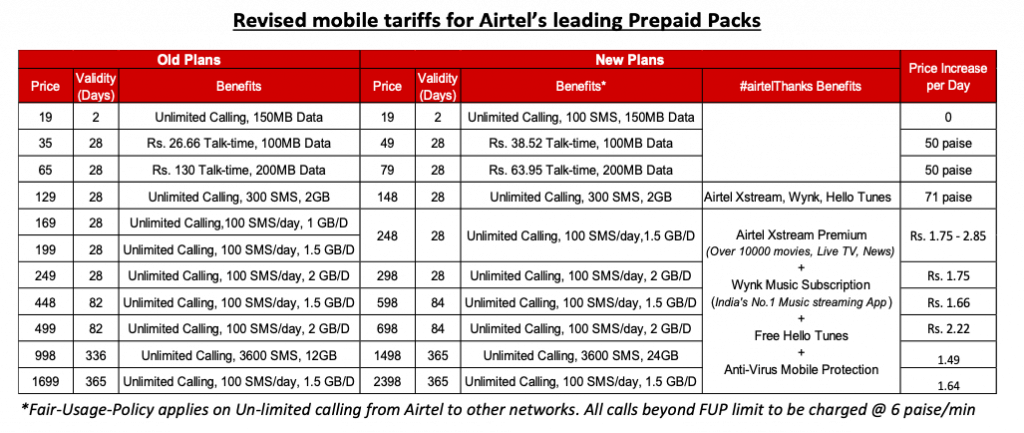 എയർടെൽ പുതുക്കിയ നിരക്ക്