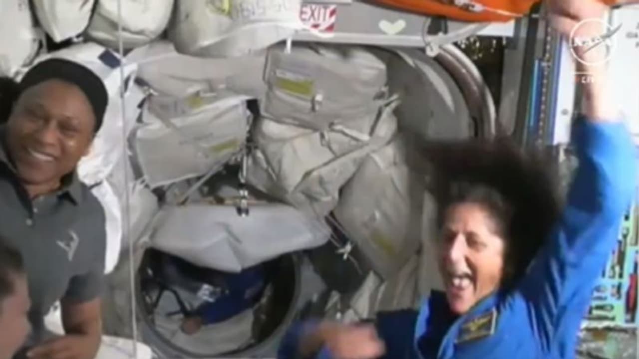 ബഹിരാകാശ നിലയത്തിലെത്തിയ സന്തോഷത്തിൽ സുനിത വില്യംസ് ചെറുനൃത്തം ചെയ്യുകയായിരുന്നു. ഇതാണ് ഇപ്പോൾ വൈറലായിരിക്കുന്നത്. ഐ.എസ്.എസിലെ മറ്റ് ഏഴ് ബഹിരാകാശയാത്രികരെ ചേർത്തുപിടിക്കുന്നതും വൈറലായിരിക്കുന്ന ദൃശ്യത്തിലുണ്ട്. ഐഎഎസിലെ പരാമ്പരാഗത മണി മുഴക്കിയാണ് സുനിതയെയും വിൽമോറിനെയും സംഘം സ്വാഗതം ചെയ്തത്.