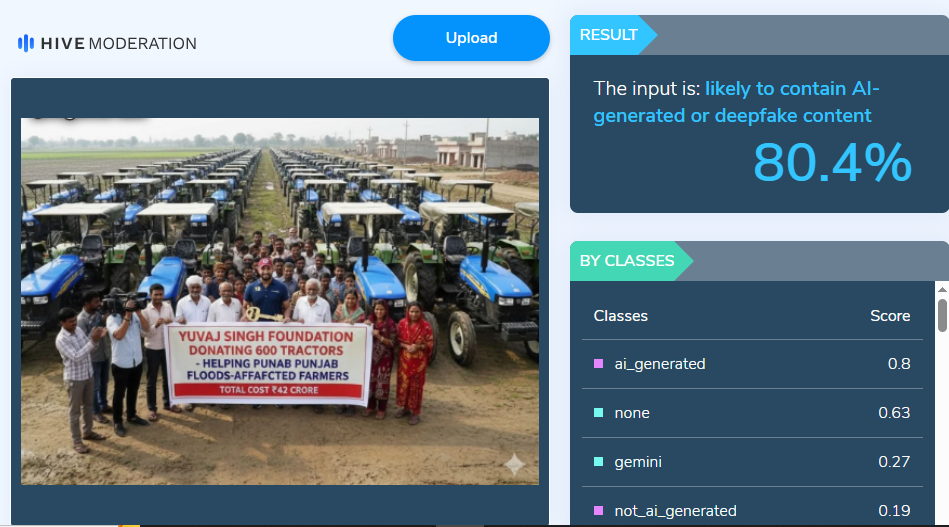 അതേസമയം, പ്രചരിക്കുന്ന വാര്ത്ത വ്യാജമാണെന്ന് യുവ്രാജ് സിംഗിന്റെ You We Can Foundation തന്നെ വ്യക്തമാക്കിയിട്ടുണ്ട് എന്ന് മനസിലാക്കാനായി. മാത്രമല്ല, ഇന്സ്റ്റഗ്രാമില് പോസ്റ്റ് ചെയ്തിരിക്കുന്ന ചിത്രത്തില് ഗൂഗിളിന്റെ ജെമിനി എഐയുടെ വാട്ടര്മാര്ക്കും കാണാം. ഇത് ഈ വൈറല് ചിത്രം എഐ നിര്മ്മിതമാണെന്ന സൂചന നല്കി. ഇതേത്തുടര്ന്ന് നടത്തിയ പരിശോധനയില് എഐ ഇമേജ് ഡിറ്റക്ഷന് ടൂളുകള് ഇക്കാര്യം ശരിവെക്കുകയും ചെയ്തു. യുവി പഞ്ചാബിലെ പ്രളയബാധിതര്ക്ക് 600 ട്രാക്ടറുകള് സമ്മാനിച്ചു എന്ന സോഷ്യല് മീഡിയ പ്രചാരണം വ്യാജമാണെന്നും ചിത്രം എഐ സൃഷ്ടിയാണെന്നും ഇതോടെ ബോധ്യമായി.