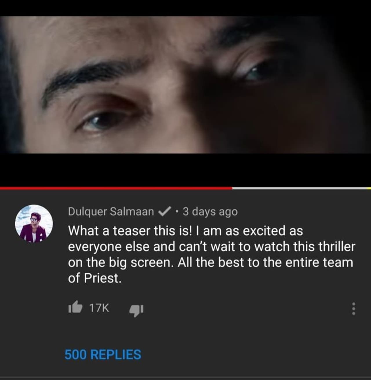 17,000ല് അധികം ലൈക്കുകളും അഞ്ഞൂറിലേറെ റിപ്ലൈകളുമാണ് ദുല്ഖറിന്റെ കമന്റിന് ലഭിച്ചത്. ഈ കമന്റിന്റെ സ്ക്രീന്ഷോട്ട് ആണ് തങ്ങളുടെ ട്വിറ്റര് അക്കൗണ്ടിലൂടെ യുട്യൂബ് ഇന്ത്യ പങ്കുവച്ചത്. ഒപ്പം ഇങ്ങനെയും കുറിച്ചു- "ദുല്ഖറിന്റെ അതേ വികാരം". ട്വീറ്റിനും വലിയ പ്രതികരണമാണ് ട്വിറ്ററില് ലഭിച്ചുകൊണ്ടിരിക്കുന്നത്.