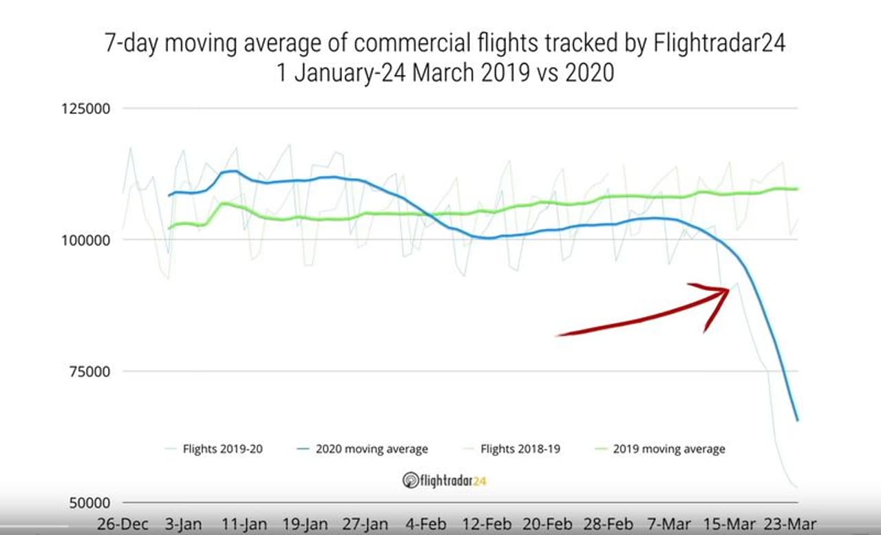ഇതില് സാം പങ്കുവയ്ക്കുന്നത് വളരെ കൗതുകരമായ കാര്യങ്ങളാണ്. കൊവിഡ് പ്രതിസന്ധിക്ക് ഒരു വര്ഷം മുന്പ് അതായത് 2019 ഇതേ സമയത്ത് ലോകത്തിലെ വിവിധ വ്യോമപാതകളില് ഒരു ദിവസം പറന്നിരുന്നത് ഒരു ലക്ഷം വിമാനങ്ങളാണ്. ഇത് ഇപ്പോള് അതിന്റെ പകുതിയില് ഏറെ താഴ്ന്ന നിലയിലാണ് എന്ന് സാം കണക്കുകളിലൂടെ കാണിച്ചുതരുന്നു. ലോകത്തിലെ വലുതും ചെറുതുമായ വിമാനതാവളങ്ങള് തീര്ത്തും വിജനമാണ്. ഇത് വിമാനതാവളങ്ങളുടെ വരുമാനം കുത്തനെ ഇടിച്ചു. യാത്രക്കാര് വിമാനതാവളത്തില് ഉപയോഗപ്പെടുത്തുന്ന ഡ്യൂട്ടിഫ്രീ ഷോപ്പുകള് പോലുള്ള സംവിധാനങ്ങളുടെ വരുമാനം ഇല്ലാതായി.