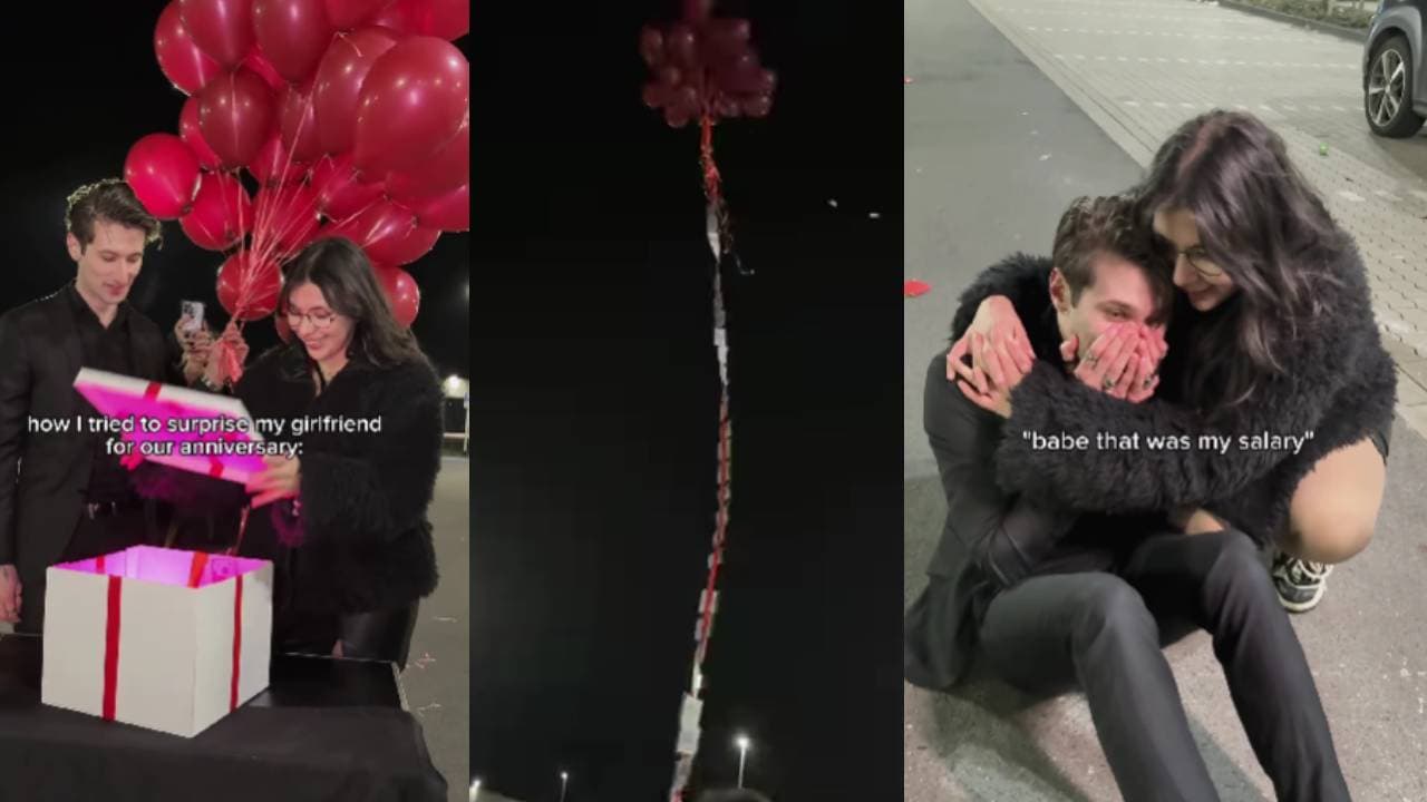 സംഭവിച്ചത് ഇങ്ങനെ, രാത്രിയിൽ ഒരു പാർക്കിംഗ് ഏരിയയിൽ വെച്ചാണ് യുവാവ് ഈ സർപ്രൈസ് ഒരുക്കിയത്. ചുവന്ന റിബൺ കെട്ടിയ വലിയൊരു വെള്ള ഗിഫ്റ്റ് ബോക്സിനുള്ളിൽ പണം കോർത്തുവെച്ച ബലൂണുകൾ യുവാവ് സജ്ജീകരിച്ചിരുന്നു. പെട്ടിക്കുള്ളിൽ നിന്ന് പിങ്ക് വെളിച്ചം പുറത്തേക്ക് വരുന്നുണ്ടായിരുന്നു. കാമുകി പെട്ടിയുടെ മൂടി തുറന്നതും പണത്തിന്റെ ചങ്ങലയുമായി ബലൂൺ ഉയർന്നുപൊങ്ങി.