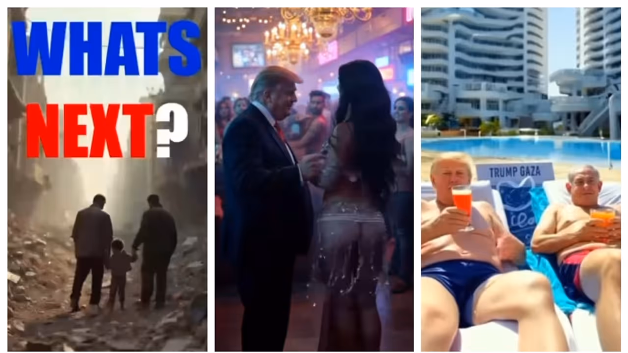 ട്രംപും മസ്കും നെതന്യൂഹുവും പുതിയ ഗാസയില് ആഘോഷത്തിമിര്പ്പില് നില്ക്കുന്ന എഐ ജനറേറ്റഡ് വീഡിയോ ട്രംപ് തന്നെയാണ് സമൂഹ മാധ്യമങ്ങളിലൂടെ പങ്കുവച്ചത്.