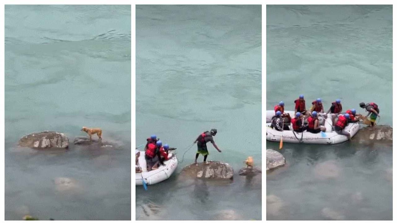 ഉത്തരാഖണ്ഡിലെ ഋഷികേശിൽ ഗംഗാനദിയിലെ ജലനിരപ്പ് പെട്ടെന്ന് ഉയർന്നതിനെത്തുടർന്ന് നദിക്ക് ഒത്ത നടുക്കുള്ള ഒരു പാറയിൽ കുടുങ്ങിപ്പോയ നായയെ സാഹസികമായി രക്ഷപ്പെടുത്തിയ റാഫ്റ്റിംഗ് സംഘം കൈയടി നേടി. ഋഷികേശിലെ ലക്ഷ്മൺ ഝൂലയ്ക്ക് സമീപമായിരുന്നു ഒരേ സമയം നൊമ്പരപ്പെടുത്തുന്നതും ചങ്കിടിപ്പേറ്റിയതുമായ ഈ സംഭവം. ഏകദേശം നൂറടിയിലേറെ താഴ്ചയുള്ള ഭാഗത്ത്, അതിശക്തമായ ഒഴുക്കിനിടയിലുള്ള ഒരു ചെറിയ കല്ലിൽ നായ ഒറ്റപ്പെട്ട് പോയത് കരയിലുണ്ടായിരുന്നവരെ വലിയ പരിഭ്രാന്തിയിലാഴ്ത്തിയിരുന്നു.