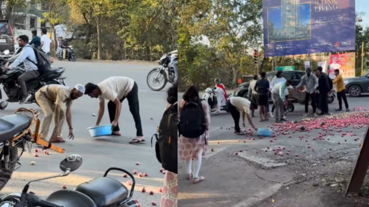 തിരക്കേറിയ റോഡിൽ നിയന്ത്രണം വിട്ടു പച്ചക്കറി വണ്ടി മറിഞ്ഞു. വണ്ടിക്കാരന് തുണയായി അപരിചിതരായ യാത്രക്കാർ. നന്മ വറ്റാത്ത മനുഷ്യരുടെ സഹായമനസ്ഥിതി എടുത്തു കാണിക്കുന്ന ഈ വീഡിയോയാണ് ഇപ്പോൾ സോഷ്യൽ മീഡിയയിൽ വൈറലായി മാറിക്കൊണ്ടിരിക്കുന്നത്. മഹാരാഷ്ട്രയിലെ നാസിക്കിലുള്ള നവ്ശ്യ ഗണപതി സിഗ്നലിന് സമീപത്ത് നിന്നാണ് ഈ വീഡിയോ പകർത്തിയിരിക്കുന്നത്.